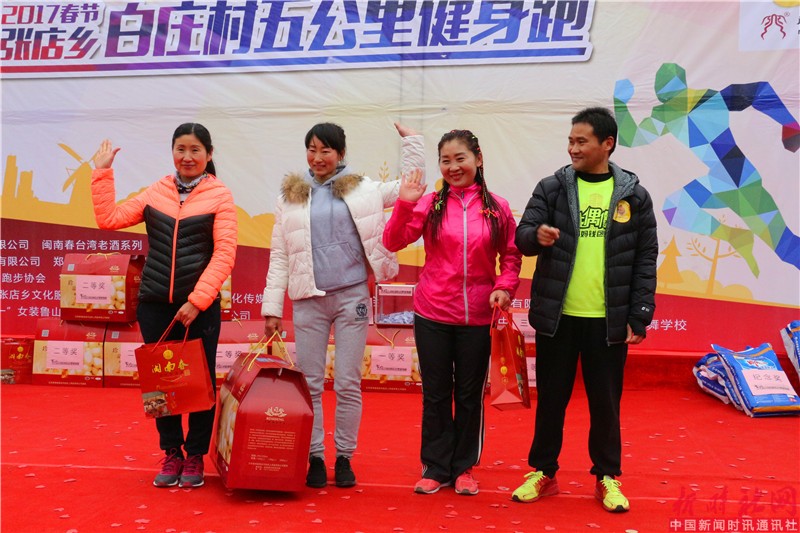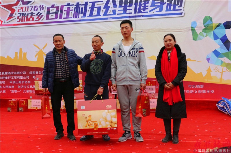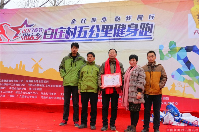 大年初四全国人民欢度新春之际,鲁山县张店乡白庄村锣鼓喧天,秧歌、跑旱船、广场舞民俗助阵表演精彩纷呈。这是有白庄村委会和几位喜爱跑步运动的跑友组织举办的五公里健身跑迷你马拉松。本次活动冠名单位是厦门金夏露酒业有限公司闽南春台湾老酒系列。跑团支持单位有河南跑吧、平顶山长跑协会、鲁山乐跑团。天禧文化传媒有限公司、郑州鲁山老乡会、鲁山火旗等单位的鼎力支持。参加此次赛事的有来自平顶山市周边县区和当地热爱运动的200余人参加了比赛,运动员中年龄最长者57岁,年龄最小的只有十岁。经过紧张而欢快的比赛,男子组翟付营以20分42秒夺得第一名,段玉获得第二名,邹金昌获得第三名。女子组程娜以27分21秒夺得第一名,张华伟获得第二名,徐红丽获得第三名。用跑步健身欢庆春节,也是为了春节期间在外的“游子”提供一个交流的平台,展现农村新风尚。用“健康跑”,来迎接新年; 用乡音诉说乡情,用全民健身传递健康;让我们告别酒场、赌场,发扬社会新风尚;同时展现鲁山的民俗、民风、人文精神面貌。