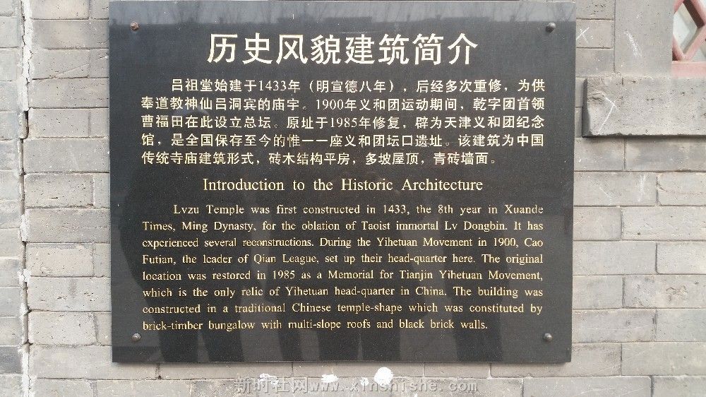 新时社网讯(特约记者 趙志丹 文献报道)吕祖堂始建于清康熙五十八年,原是供奉仙人吕洞宾的道观,后辟为天津义和团纪念馆。著名的紫竹林、老龙头战斗以及整个天津保卫战的战斗计划都是在此拟定的。历史渊源极高。