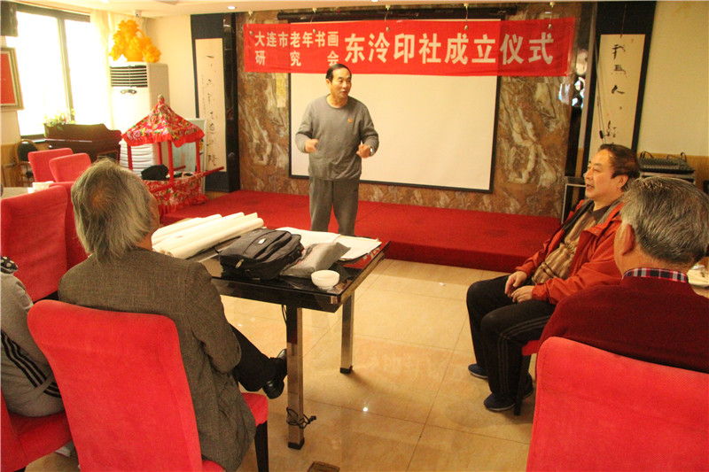成立仪式由副社长兼秘书长 王晓江 主持。首先由「大连市老年书画研究会」常务副会长 李惠兰 女士宣布「东泠印社」领导成员名单,再由老领导 周广梁 先生发表祝贺讲话,会长 宋吉仁 宣读协会章程、会员名单,并宣布「东泠印社」成立。宋吉仁 会长指出:我们要坚持习总书记的重要讲话精神:“高擎民族精神火炬,吹响时代前进号角,把艺术理想融入党和人民事业之中,努力筑就中华民族伟大复兴时代的文艺高峰。”我们要以「东泠印社」的成立为新的平台和契机,潜心研究琢磨,创作精品力作;组织开展活动,营造浓厚文化氛围;切实健全机制,加强印社建设;提高艺术修养,树立良好形象,培养篆刻艺术人才,将「东泠印社」打造成为全国知名的篆刻艺术品牌印社。