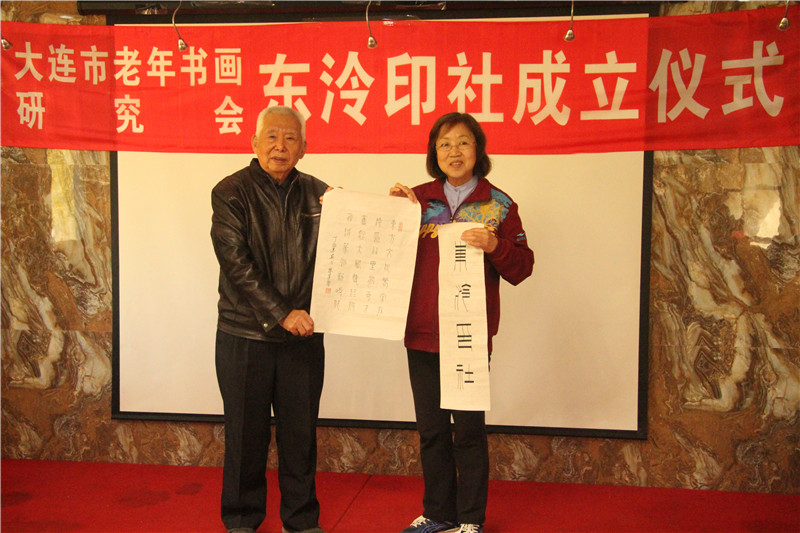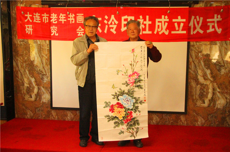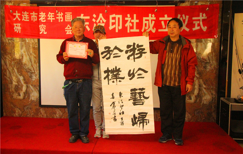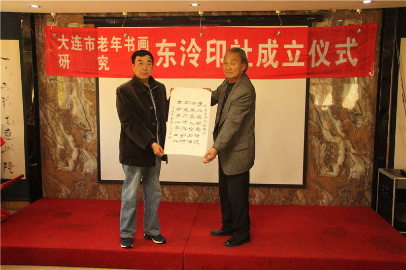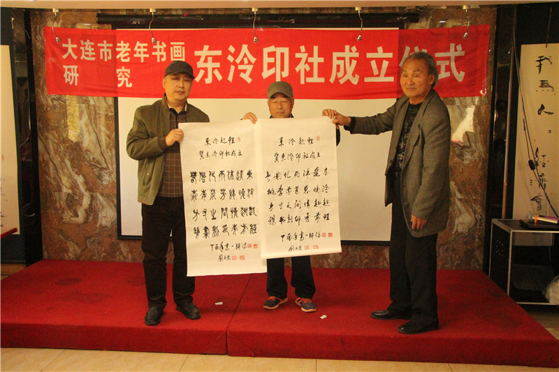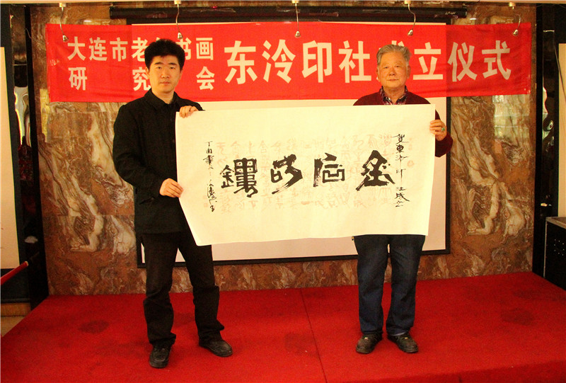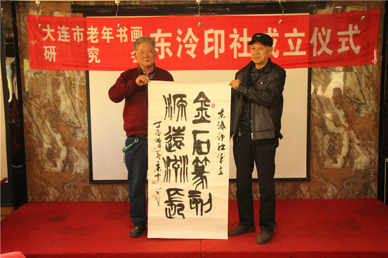 仪式上,「东泠印社理事会」现场聘请「西泠印社」社员「辽宁师范大学美术学院」教授 栾传益 先生、「大连书法家协会」理事「博雅书画院」院长 周广梁 先生、「大连诗词协会」会长 王国川 先生为「东泠印社」艺术顾问,接受了几位艺术顾问带来的祝贺作品,并向几位艺术家颁发聘书。「中国海峡两岸书画家协会大连分会」会长 孙乐廷 先生、副会长 何涛 先生、常务理事 张华茂 先生专程前来祝贺,孙乐廷 会长宣读了「中国海峡两岸书画家协会大连分会」对「东泠印社成立仪式」的贺信,何涛 副会长题写《金石可镂》、张华茂 常务理事献《万紫千红总是春》牡丹图致贺「东泠印社」成立。「东泠印社」的社员们也纷纷地献上了祝贺作品。「辽宁老年报社」记者 葛云福 先生、「城里网」摄影记者 楊玉福 先生也作为嘉宾出席了成立仪式。