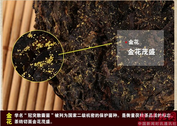 手筑茯茶中的黄色颗粒"金花",在茶叶的衬托下花开朵朵,十分诱人。金花又名冠突散囊菌,在千年灵芝上偶尔发现过,是特有的益生菌种,是国家茶行业唯一二级机密保护菌种。