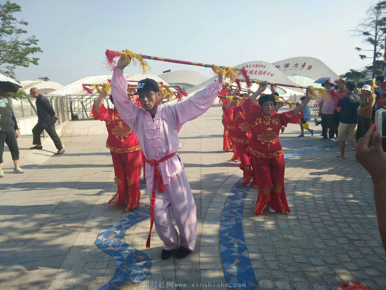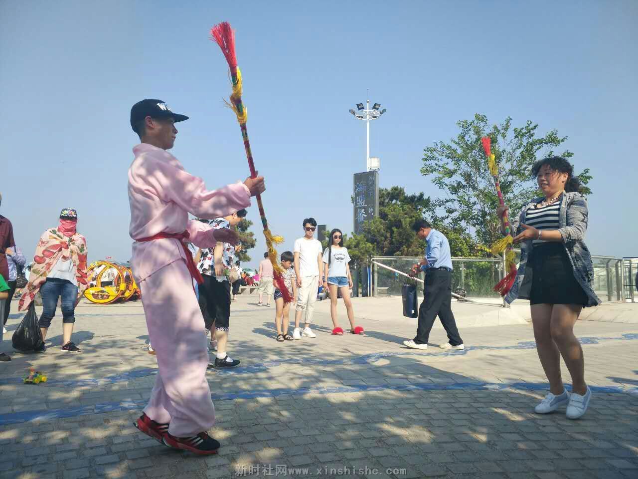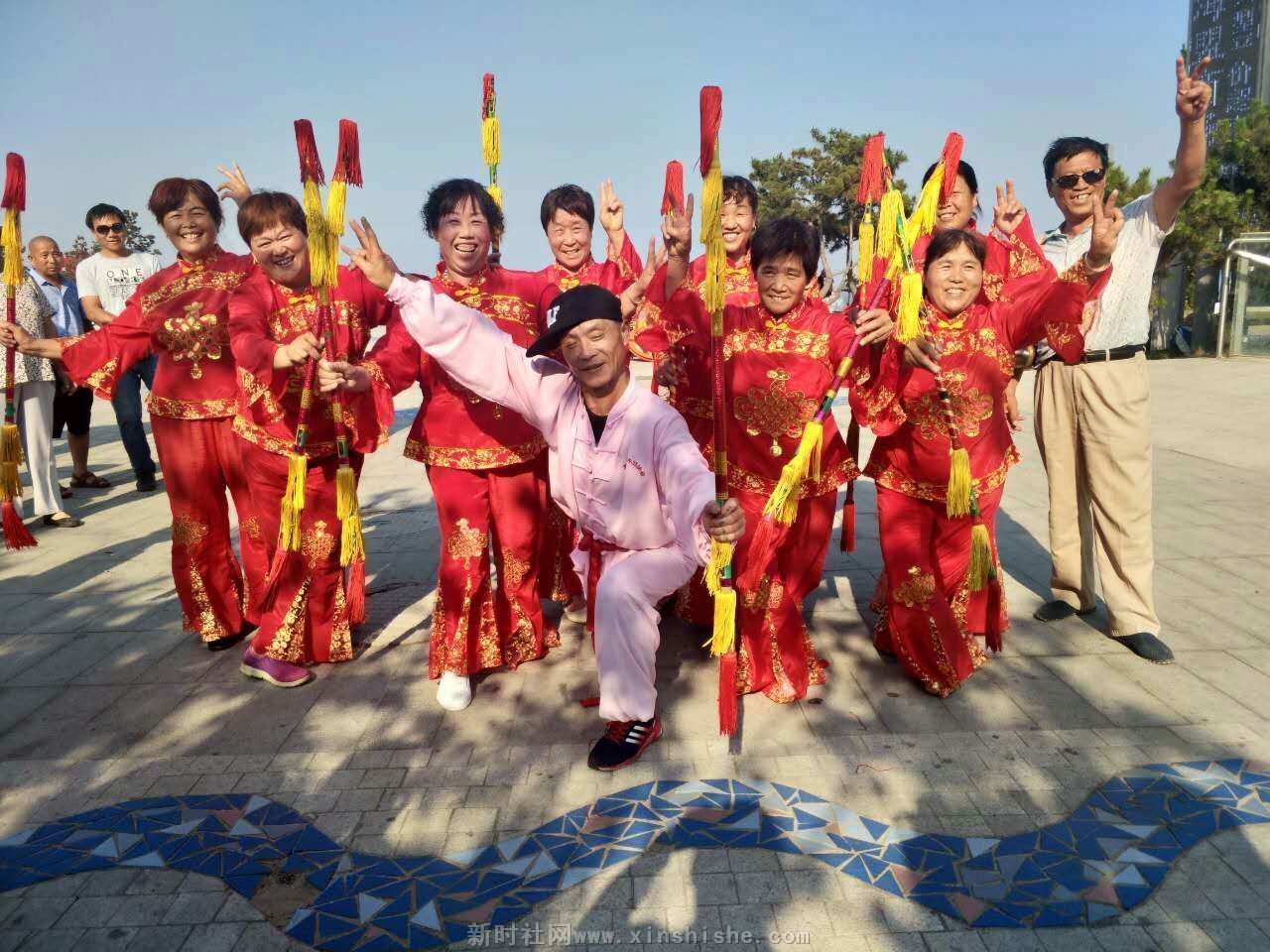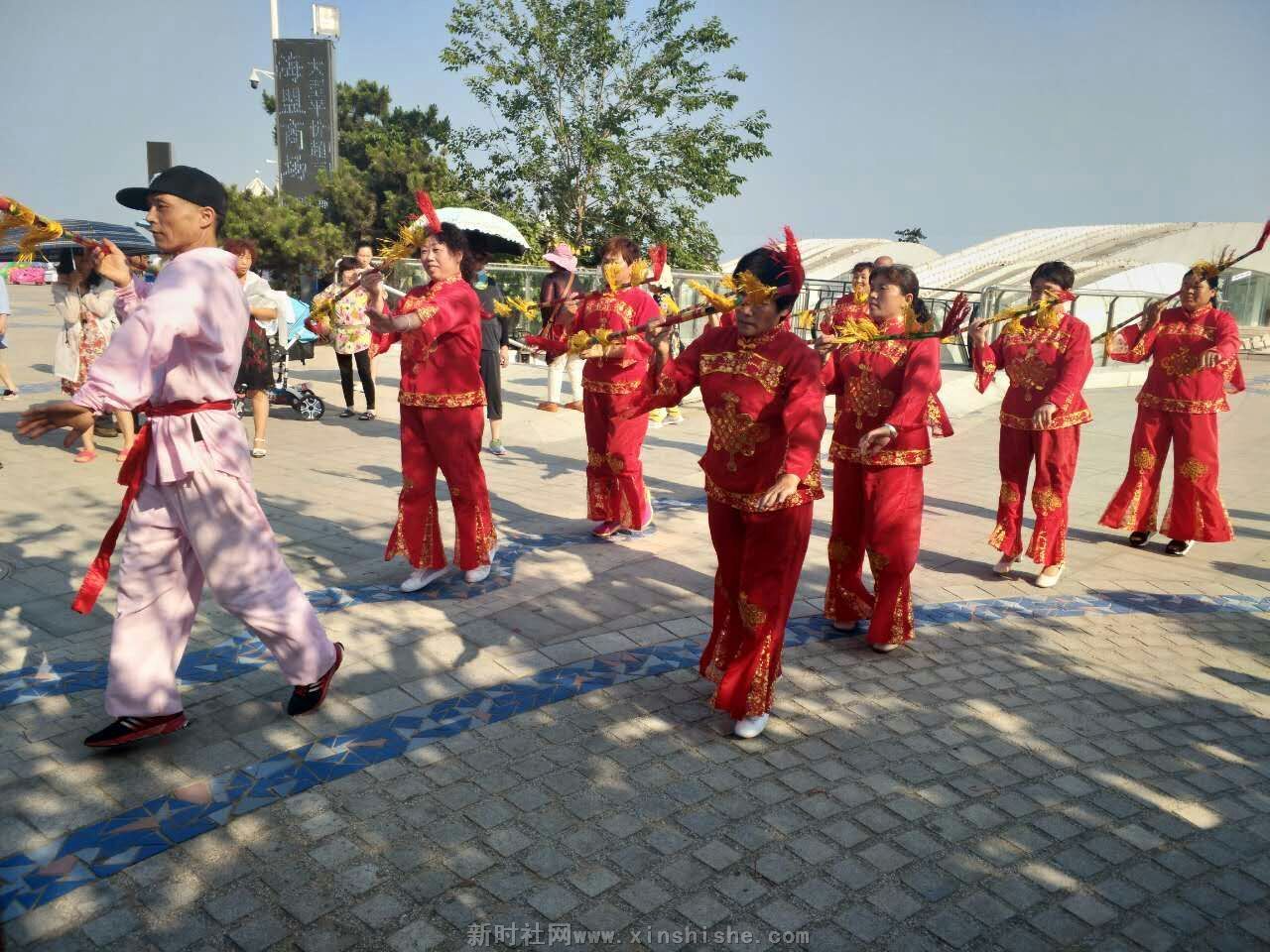 【中国新闻时讯通讯社陈运发日照报道】2017年6月17日,来山东日照旅游的安徽毫州民协花棍舞舞蹈队的快乐老妈们在日照市海滨浴场前义务为游客献演。音乐伴着花棍舞,掌声伴着笑声,来自河南、河北、山东等地的游客纷纷叫好,为海滨广场增加了热闹气氛。广大观众立足拍照,赞扬大妈们的精彩表演及义务奉献精抻。