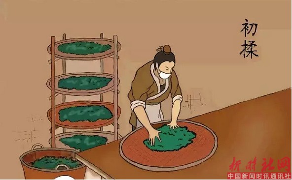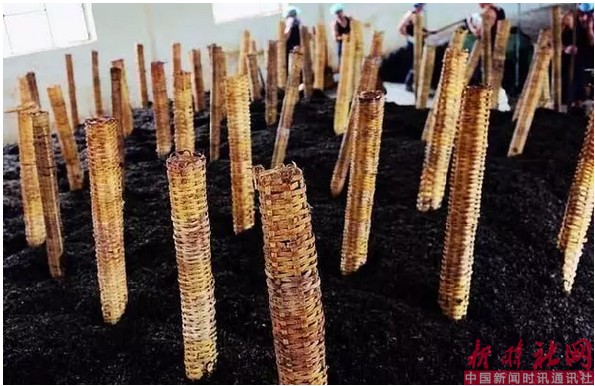 初揉后的茶坯,不经解块立即堆积起来,堆高约1米左右,表面覆盖湿布或蓑衣等物,以保温保湿。