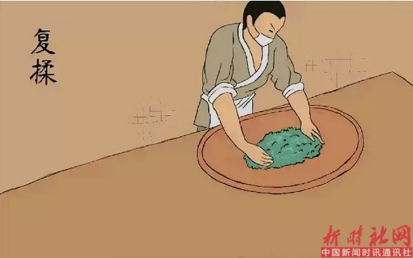 将渥堆适度的黑茶茶坯解块后,上机复揉,压力较初揉稍小,时间一般6~8分钟。下机解块,及时干燥。