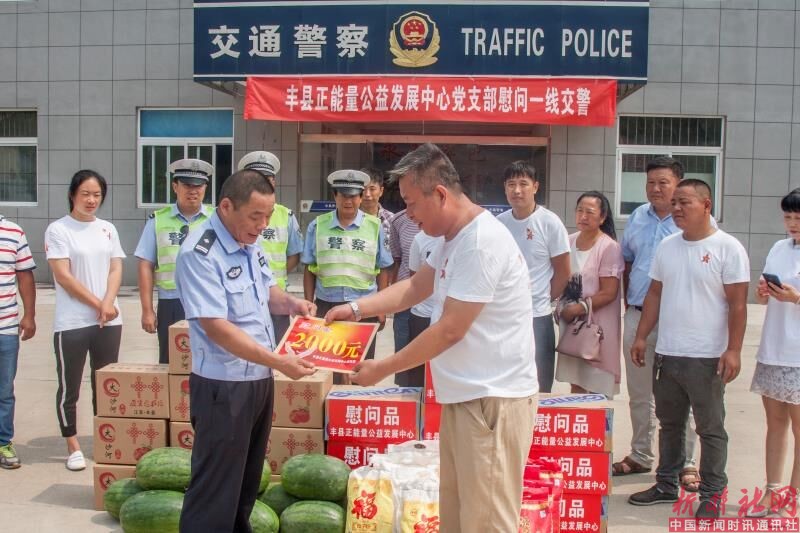 正能量公益7月4日丰县电(高荣光 张丹丹)7月4日,江苏丰县烈日炎炎,气温高达36度。丰县正能量公益发展中心20名党员志愿者在丰县交警大队副大队长王兵的陪同下,来到华山中队看望慰问冒着酷暑奋战在一线执勤的交通民警。党员志愿者为民警带来面粉、大米、食用油、纯净水、水蜜桃、西瓜等水果及夏季降温用品。