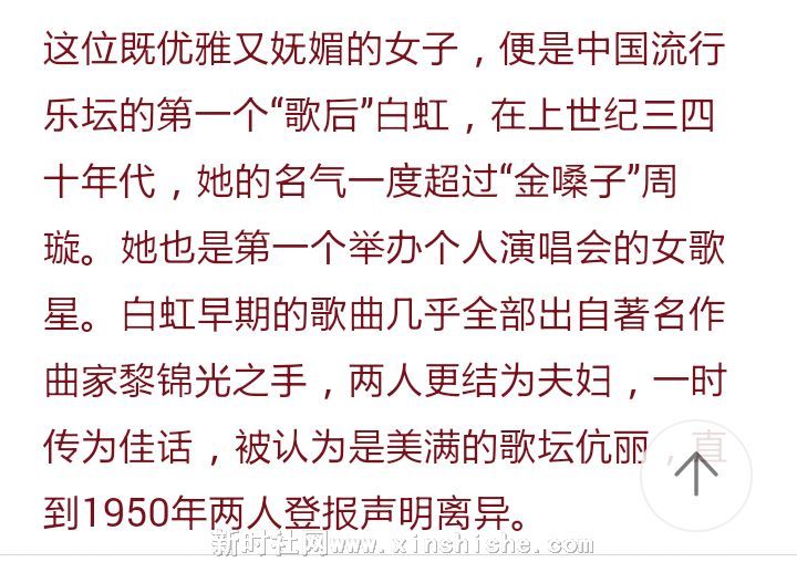 选举票数很接近,结果也不出所料,特别是前两名都是明月社出身(周璇也曾是黎氏门下),这说明,在30年代中期的上海,黎派音乐依然很有实力。当时,白虹的名声确实要比周璇响。白虹原名白丽珠,和周璇同岁,都生于1919年。她的嗓音条件很好,音域也较宽,很适合在舞台上演出。当时有人撰文赞扬她:“白虹就是应该属于舞台的,她的歌喉是宏亮而遥远的,她的发音是结实而动听的。”