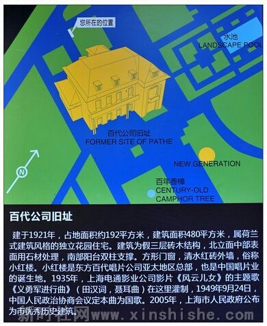 特约记者趙志丹文献报道:百代公司旧址;建于1921年,占地192平米,属荷兰式建筑风格独立花园住宅,清水红砖外墙,俗称小红楼,是东方百代唱片公司亚太地区总部,也是中国唱片公司业的诞生地,1935年上海电通影业公司影片《风云儿女》主题歌《义勇军进行曲》在这里灌制,1949年9,24定为国歌。