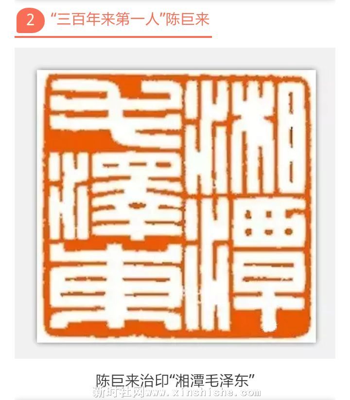 1956年,上海市人民政府请陈巨来刻“湘潭毛泽东”一印。陈13岁就开始刻印,平生治印逾三万方,其篆刻被誉为“三百年来第一人”。对“湘潭毛泽东”一印,陈巨来慎审精思,三易其稿,一反他擅长的元朱文,最终决定以白文布局,处理得雄壮浑厚,大气磅礴。