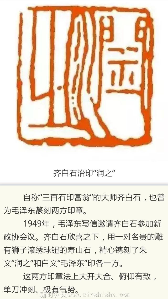 1949年,毛泽东写信邀请齐白石参加新政协会议。齐白石欣喜之下,用一对名贵的雕有狮子滚绣球钮的寿山石,精心镌刻了朱文“润之”和白文“毛泽东”印各一方。