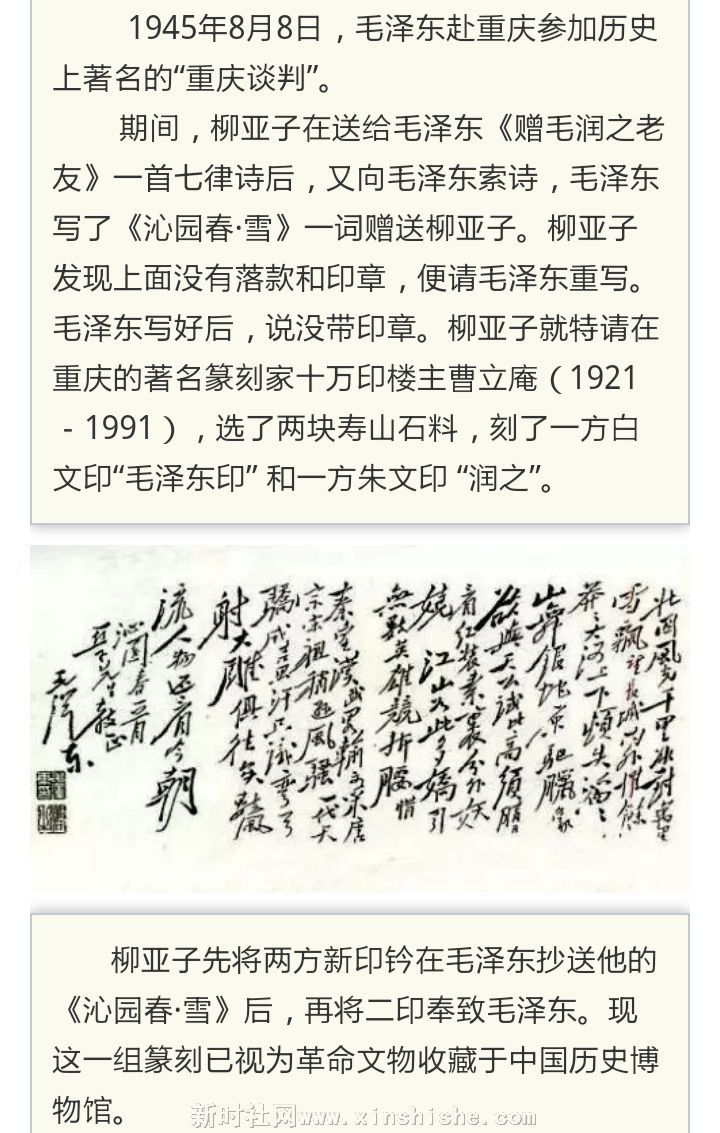 期间,柳亚子在送给毛泽东《赠毛润之老友》一首七律诗后,又向毛泽东索诗,毛泽东写了《沁园春·雪》一词赠送柳亚子。柳亚子发现上面没有落款和印章,便请毛泽东重写。毛泽东写好后,说没带印章。柳亚子就特请在重庆的著名篆刻家十万印楼主曹立庵(1921-1991),选了两块寿山石料,刻了一方白文印“毛泽东印” 和一方朱文印 “润之”。