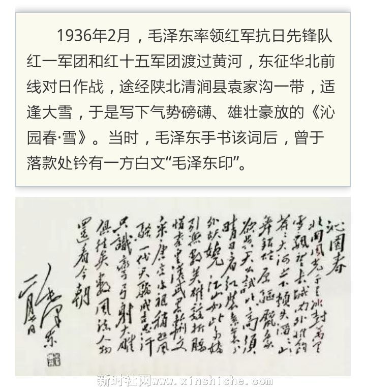 1936年2月,毛泽东率领红军抗日先锋队红一军团和红十五军团渡过黄河,东征华北前线对日作战,途经陕北清涧县袁家沟一带,适逢大雪,于是写下气势磅礴、雄壮豪放的《沁园春·雪》。当时,毛泽东手书该词后,曾于落款处钤有一方白文“毛泽东印”。