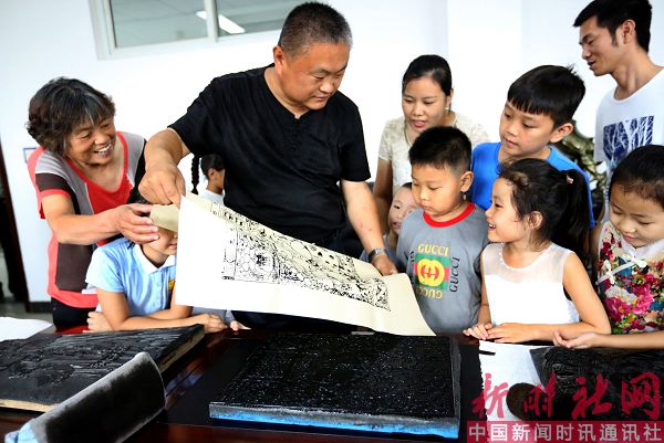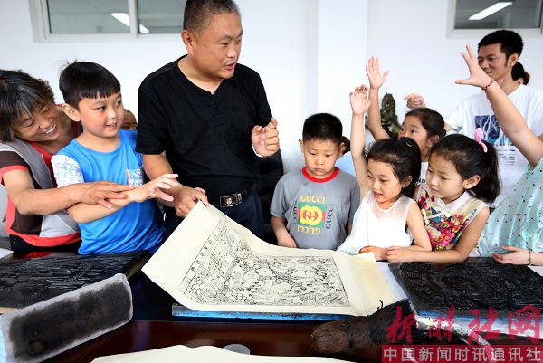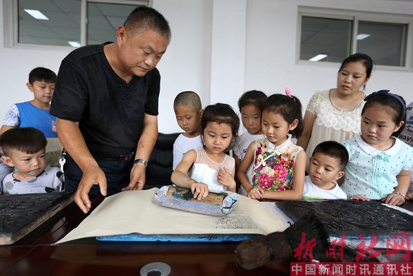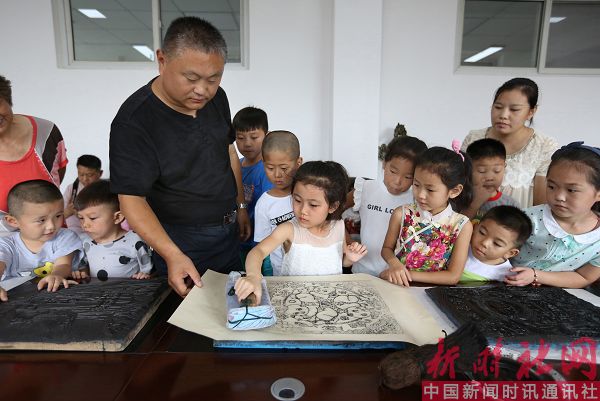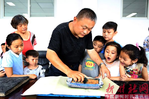 2017年8月3日,河南省安阳市妇女儿童活动中心,来自内黄县民间艺人、非物质文化遗产项目(池家年画)代表性传承人池建周正在教小朋友学习池家木版年画印制技艺,让孩子们零距离感受到祖国传统文化的魅力,既增长了知识又丰富了暑假生活。