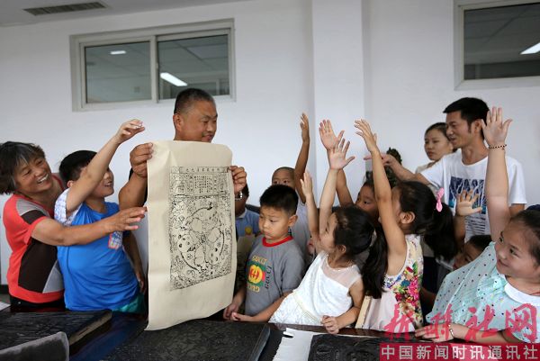 2017年8月3日,河南省安阳市妇女儿童活动中心。木版年画印刷好了,池建周老师让小朋友举手回答:画面中有几个娃娃?谁答对了就送给谁!