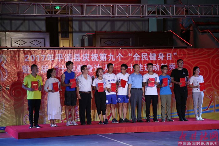 山西站站长杨文阁报道:九个全民健身日暨首届“十佳健身达人,十佳运动新秀”颁奖晚会在县体育馆举行。市体育局副局长杨建功、副县长阎丰琴、县政协副主席王东光等出席并为健身达人颁奖。