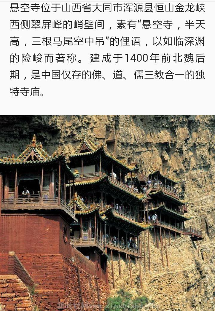 特约记者趙志丹文献报道:悬空寺位于山西省大同市浑源县恒山金龙峡西侧翠屏峰的峭壁间,素有“悬空寺,半天高,三根马尾空中吊”的俚语,以如临深渊的险峻而著称。建成于1400年前北魏后期,是中国仅存的佛、道、儒三教合一的独特寺庙。