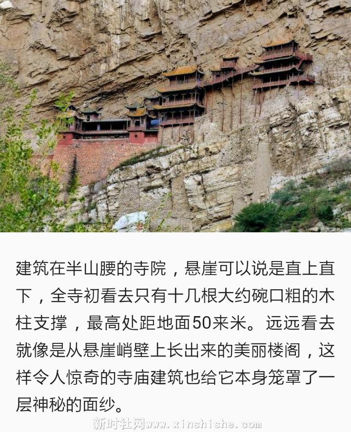 建筑在半山腰的寺院,悬崖可以说是直上直下,全寺初看去只有十几根大约碗口粗的木柱支撑,最高处距地面50来米。远远看去就像是从悬崖峭壁上长出来的美丽楼阁,这样令人惊奇的寺庙建筑也给它本身笼罩了一层神秘的面纱。