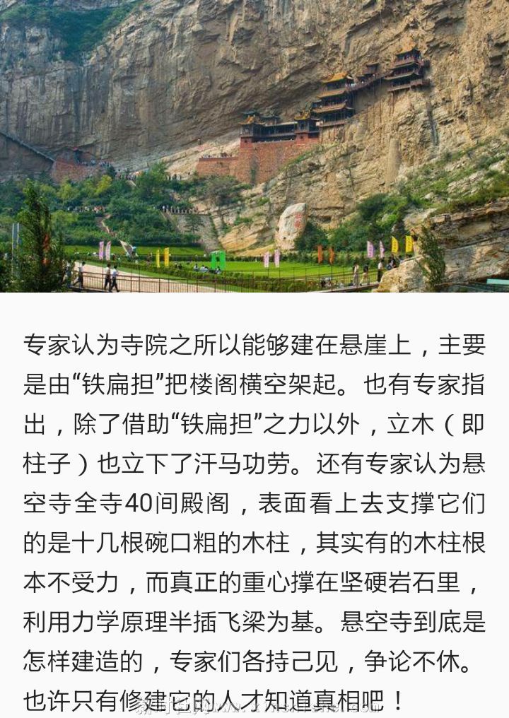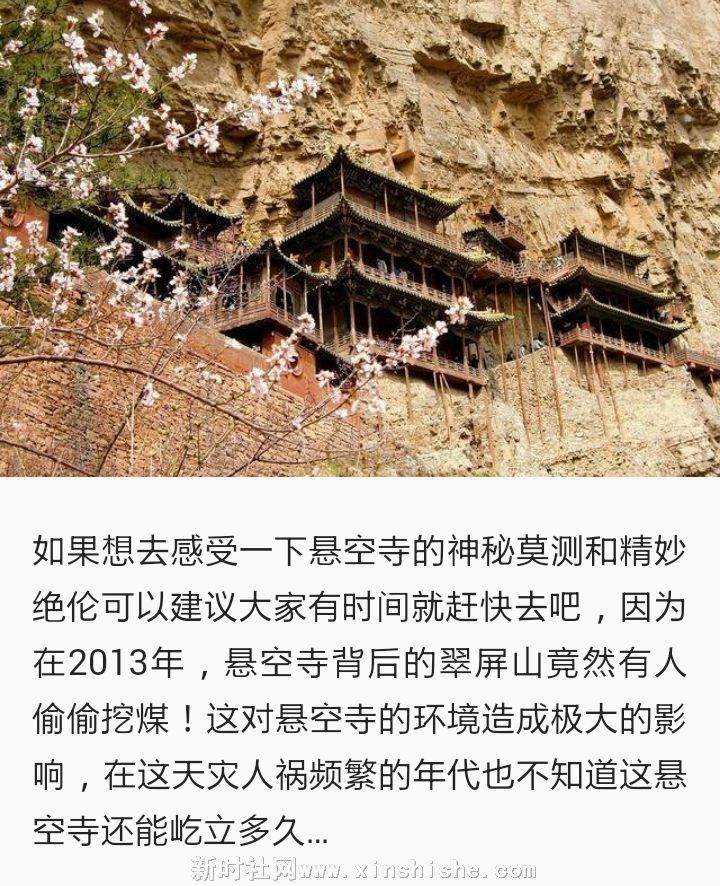 如果想去感受一下悬空寺的神秘莫测和精妙绝伦可以建议大家有时间就赶快去吧,因为在2013年,悬空寺背后的翠屏山竟然有人偷偷挖煤!这对悬空寺的环境造成极大的影响,在这天灾人祸频繁的年代也不知道这悬空寺还能屹立多久…