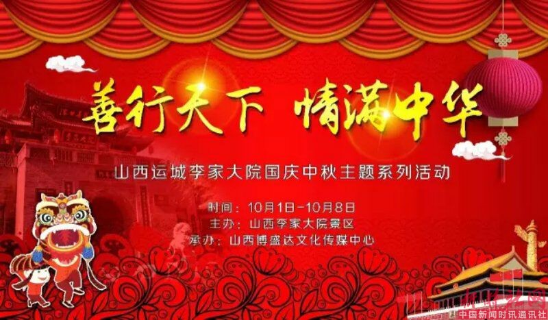 双节同庆,金风送爽,超级黄金周将至。2017年国庆中秋佳节来临之际,山西运城李家大院重磅推出“善行天下、情满中华”国庆中秋主题系列活动,以晋商大院独具魅力、内涵丰富的古代民居建筑文化为依托,精心打造大型金秋花展,举办大型历史情景剧和歌舞杂技系列活动,为来自全国各地的游客奉献一次满满正能量的黄金周超值之旅。