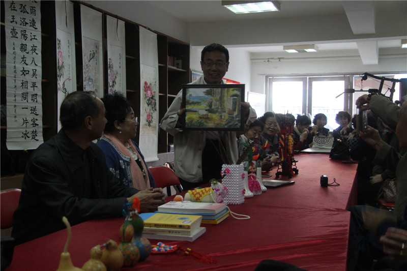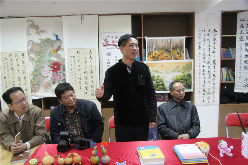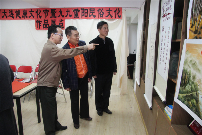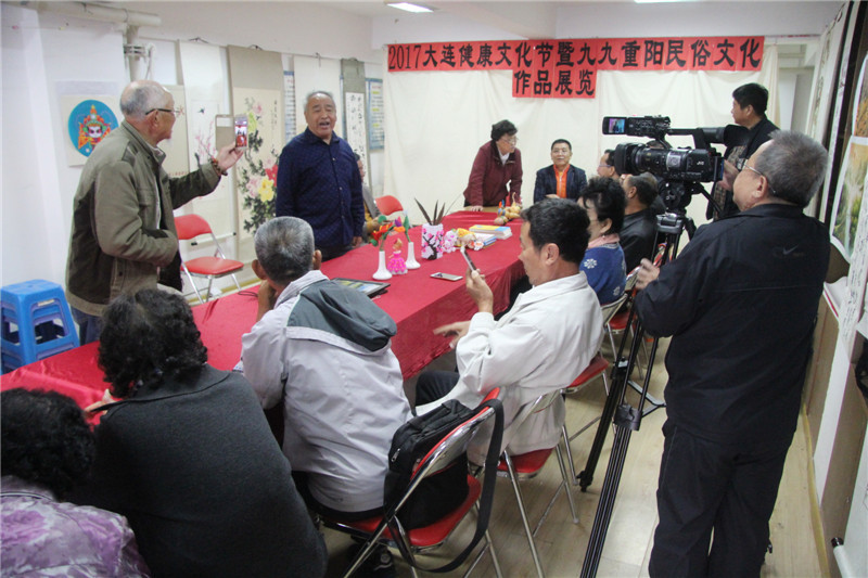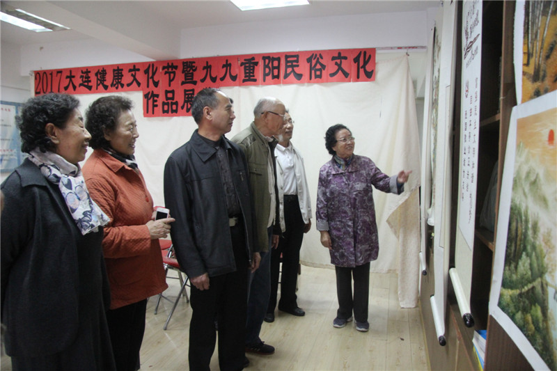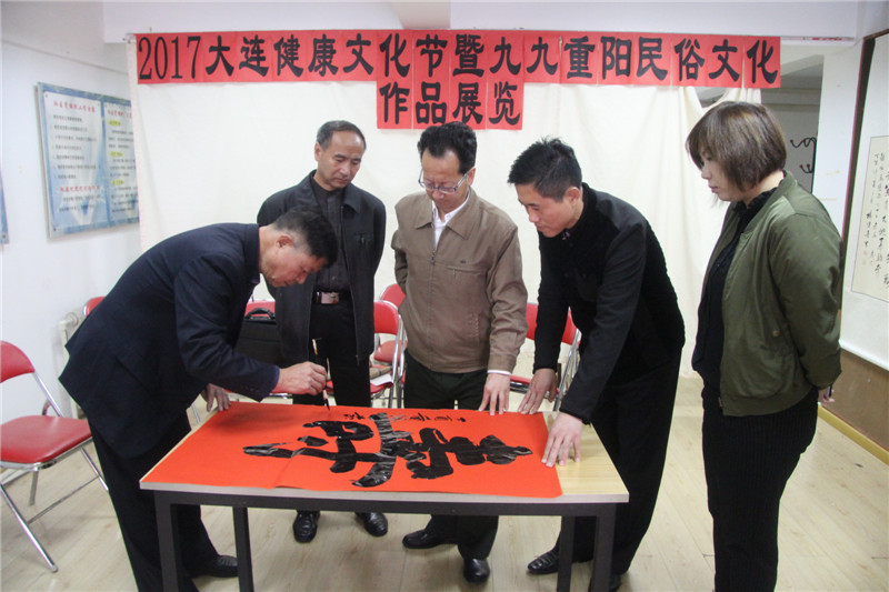 每年农历9月9日是中华民族传统的敬老节日重阳节,也是我国第一个法定的“老年节”。在十九大的胜利闭幕之际,为了活跃老年人的文化生活,不断增强全社会老龄意识,营造孝亲敬老,关爱老年人的社会氛围,提高老年人生活品质,促进老年人相互沟通及老年人与社区的联谊沟通,2017年10月27日,“2017大连健康文化节暨九九重阳民俗文化作品展”在沙河口区南沙街道兰亭社区民俗文化活动室开展。兰亭社区书记郑晓楠、兰亭社区民俗文化艺术协会会长张金华、中国文化魂书画研究院副院长何涛、辽宁省书法家协会会员杨继喜等艺术家、辖区居民60余人参加了展览活动。