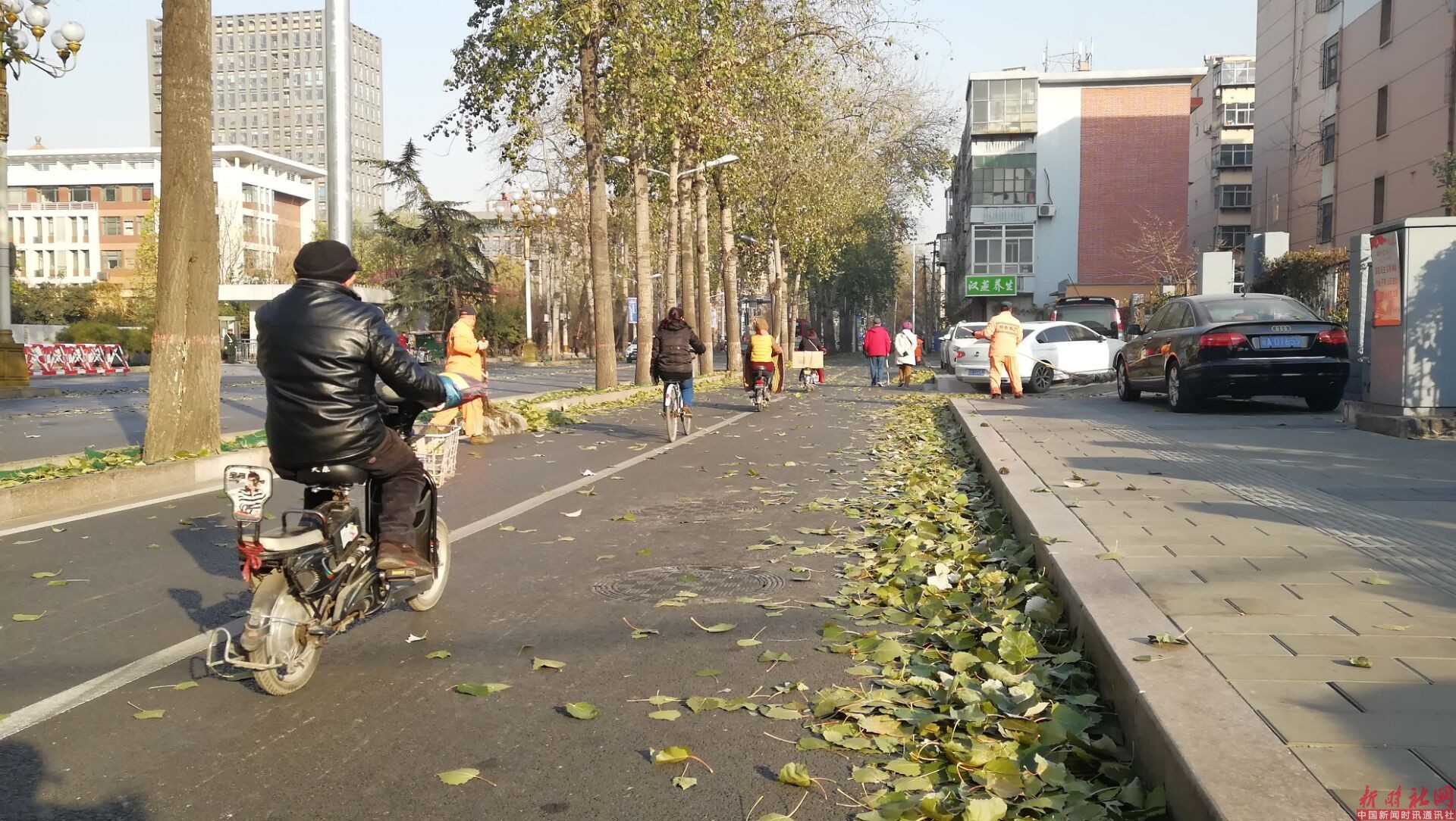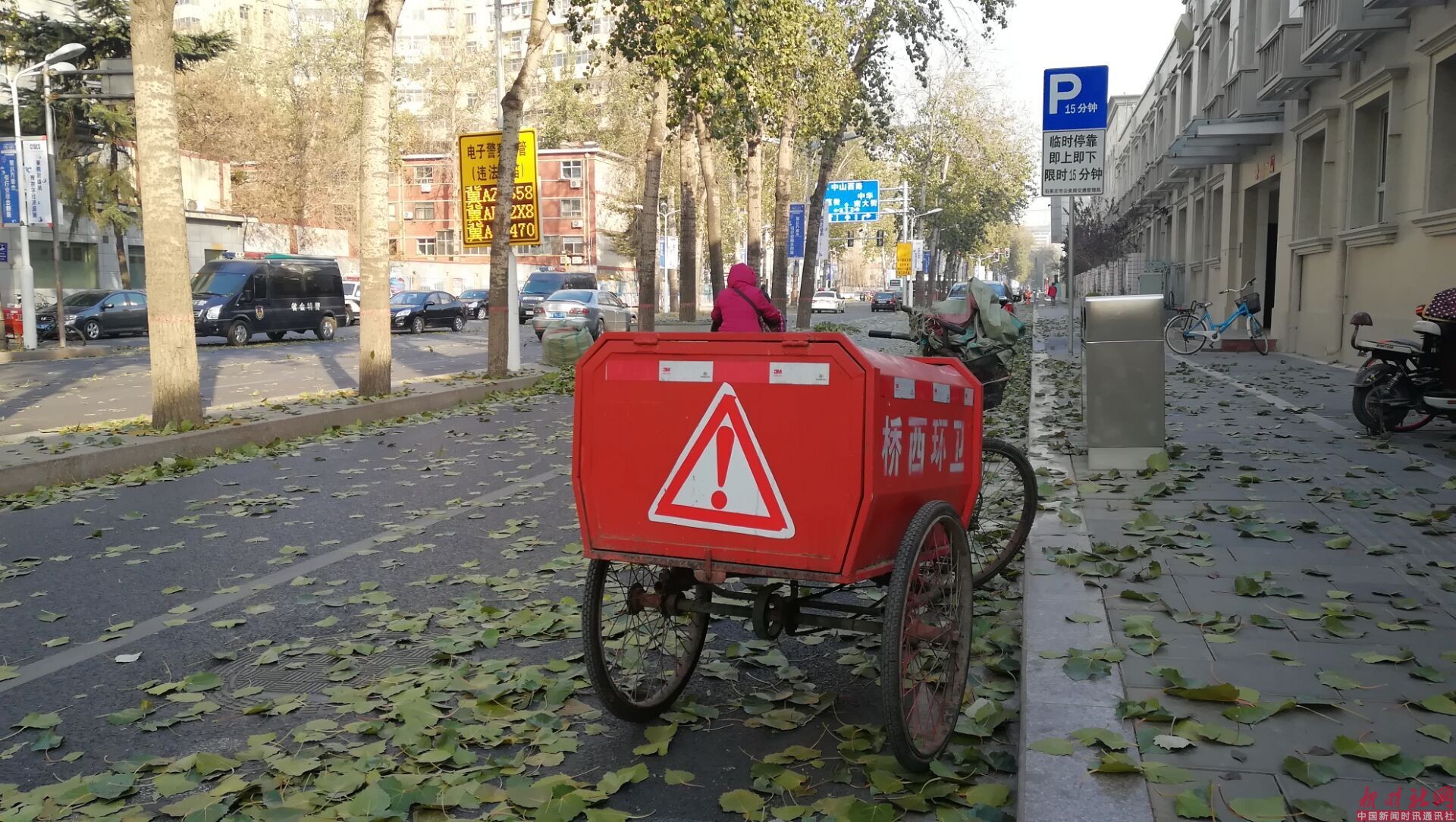 落在地上厚厚一层树叶,会从这里通行的自行车时候会造成滑倒,也影响城市的环境。这种冬日的景色却忙坏了石家庄桥西环卫工人们,他们穿着厚厚的工作服,全副武装,捂得严严实实。在清扫着树叶。落叶也被他们扫成了一堆儿,又装在了麻袋里。可风一直吹树叶一直在落,刚清扫完地面,又被树叶铺满了一层。他们就这样一遍遍的清扫,也有一些无奈,但为了城市的整洁,行人的安全,他们也只好这样一遍一遍的重复。