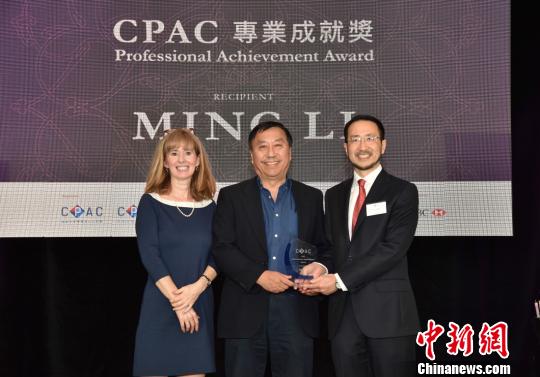 CPAC会长肖楚强(右)及CPAC基金会理事Marilyn Flanagan(左)为2017 CPAC专业成就奖获奖者、加拿大首席科学家李明颁奖。 加拿大中国专业人士协会供图