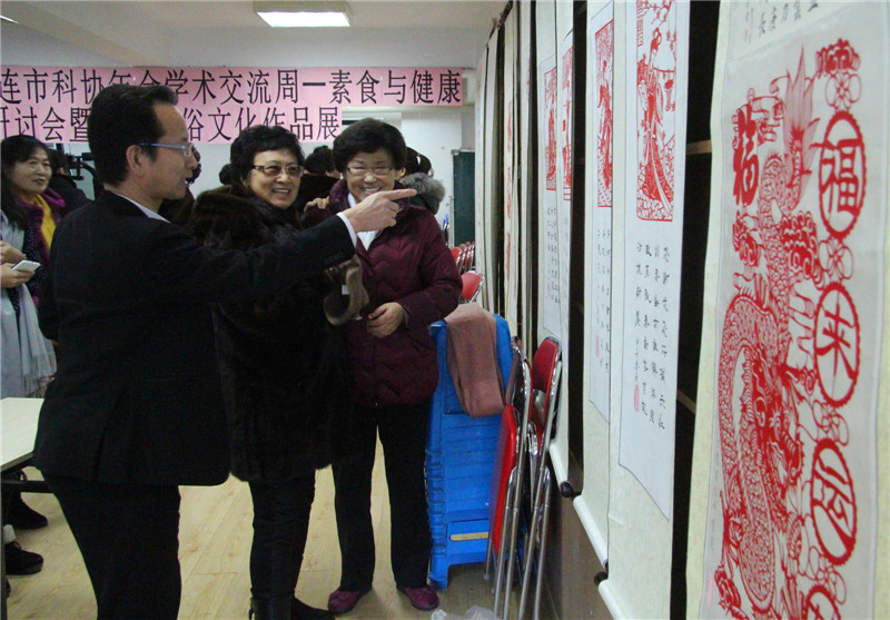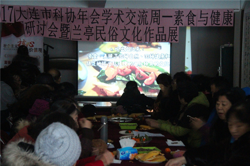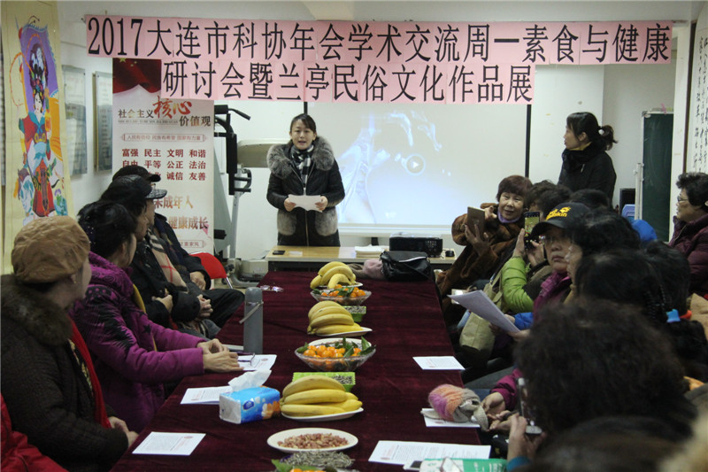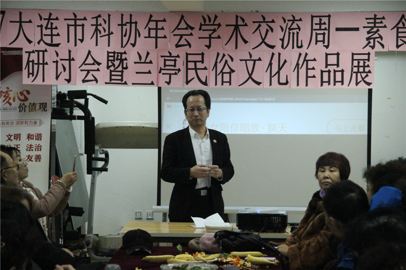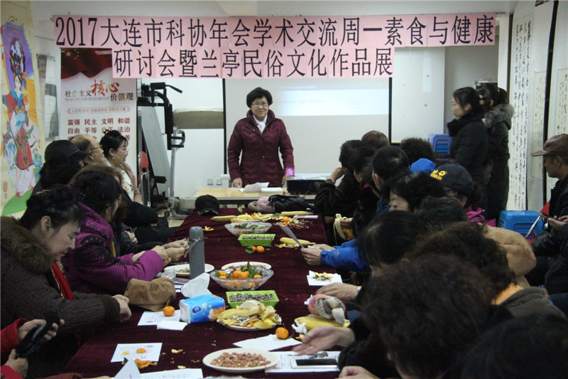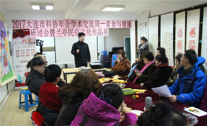 党的十九大报告明确提出:“人民健康是民族昌盛和国家富强的重要标志”。没有全民健康,就没有全面小康。为了认真学习贯彻十九大报告精神,把党的十九大精神落到实处,2017年12月13日9时,大连市沙河口区南沙街道兰亭社区在2017大连市科协年会学术交流周期间,于兰亭社区文化活动室举行“素食与健康”文化研讨会。会议邀请了「兰亭社区民俗文化艺术协会」会长 张金华、「中国文化魂书画研究院」副院长 何涛、「辽宁省书法家协会」会员 杨继喜、老年互联网大连学院院长 厚荣有等文化艺术界人士以及广大辖区居民,以“关注养生健康、倡导素食文化”为主题,就健康与饮食,健康与养生等问题进行了研讨与交流。