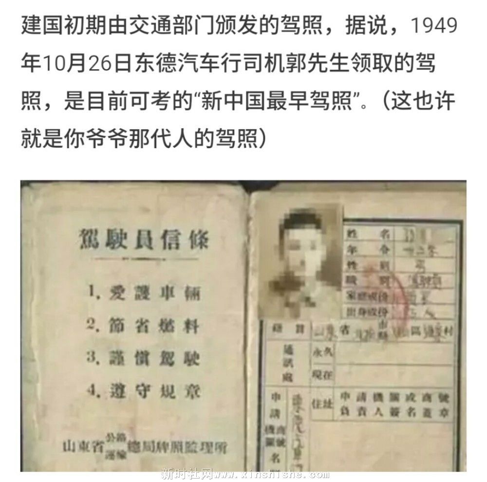 建国初期由交通部门颁发的驾照,据说,1949年10月26日东德汽车行司机郭先生领取的驾照,是目前可考的“新中国最早驾照”。