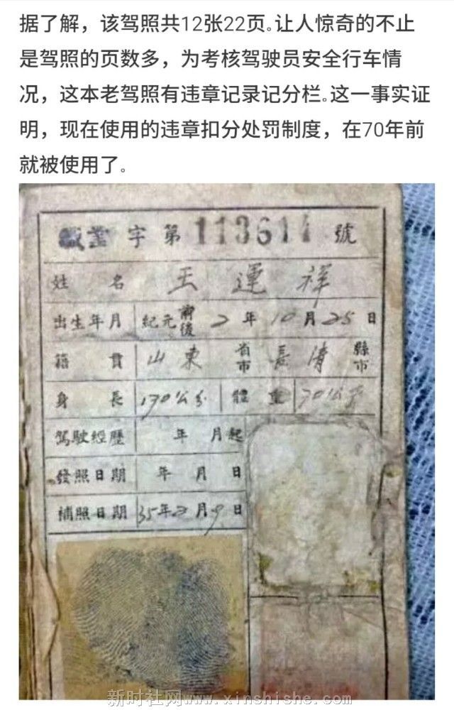 据了解,该驾照共12张22页。让人惊奇的不止是驾照的页数多,为考核驾驶员安全行车情况,这本老驾照有违章记录记分栏。这一事实证明,现在使用的违章扣分处罚制度,在70年前就被使用了。