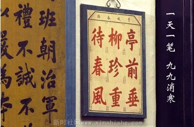 《九九消寒图》,成为帮助人们度过寒冷、消遣冬日时光的书画游戏。因为极为风雅,怡情悦性,又操作方便,颇受欢迎,延续至今。如今故宫的养心殿还悬挂着一张填字消寒图,透过这张消寒图,我们还可以想象当年宫中描写消寒图的生活场景,历史不再陌生,一下子生动鲜活起来。而今天我们依然延续这种风雅,承传着这一习俗。