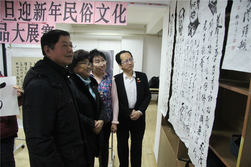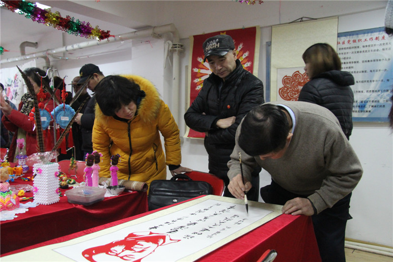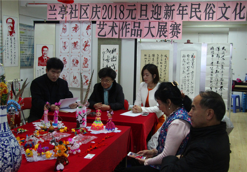 为了丰富广大人民群众的精神文明、物质文化生活,让群众过上一个开开心心、红红火火的节日,在2018年元旦来临之际,于2017年12月17日9时,大连市沙河口区南沙街道兰亭社区在兰亭社区文化活动室精心组织、开展了兰亭社区“庆2018元旦 迎新年”民俗文化艺术作品大展赛。辖区居民品尝到各种“民俗文化盛宴”,增添了节日喜庆气氛。来自兰亭社区民俗文化艺术协会以及辖区的60余名民俗文化艺术家、爱好者参加了大展赛,「兰亭社区」书记 郑晓楠、「兰亭社区民俗文化艺术协会」会长 张金华、「中国文化魂书画研究院」副院长 何涛分别作了讲话。
