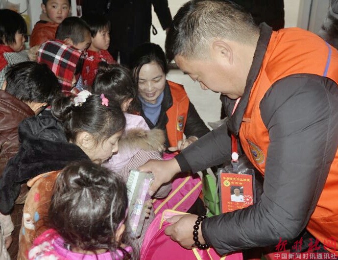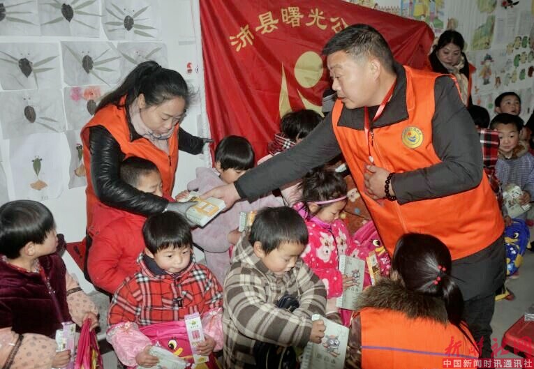 1月16日上午,江苏沛县曙光公益协会的自愿者在理事长张佳玉的带领下,带着自愿者购买的羽绒服,书包,文具盒等慰问品,走进校园为困境儿童送上一份温暖.
