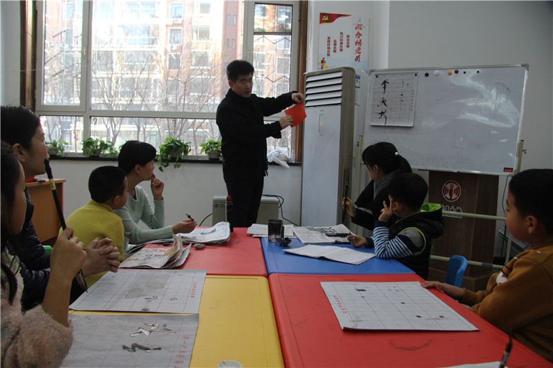活动中,「大连市沙河口区马栏街道关工委」常务副主任 张大艳 同志首先做了发言:现在城里孩子对过年的感觉越来越淡了,希望通过这次迎新春写对联专题活动,能让同学们感受到中国人过年的喜庆味道,真切体验到了传统文化的魅力,进一步增强对中国传统年俗的理解。随后,「中国文化魂书画研究院」副院长、「马栏街道青少年公益书法教室」书法指导教师 何涛 老师向同学们介绍了有关春联的传统文化知识。何涛 老师告诉同学们,书法是最具有中国传统文化特色的一门艺术,而写春联、贴春联又是一项深受老百姓喜爱的传统过年习俗,春联也叫“门对”、“春贴”、“对联”、“对子”,它以对仗工整、简洁精巧的文字描绘美好形象,抒发美好愿望,是汉族特有的文学形式。同学们及其家长们边听讲边摆好文房四宝,在何涛老师的指导下,便开始大显身手、泼墨挥毫,一幅幅洋溢着节日气息的“春联”、一个个苍劲有力的“福”字,为即将到来的新春佳节点燃了缕缕红色的祝福!