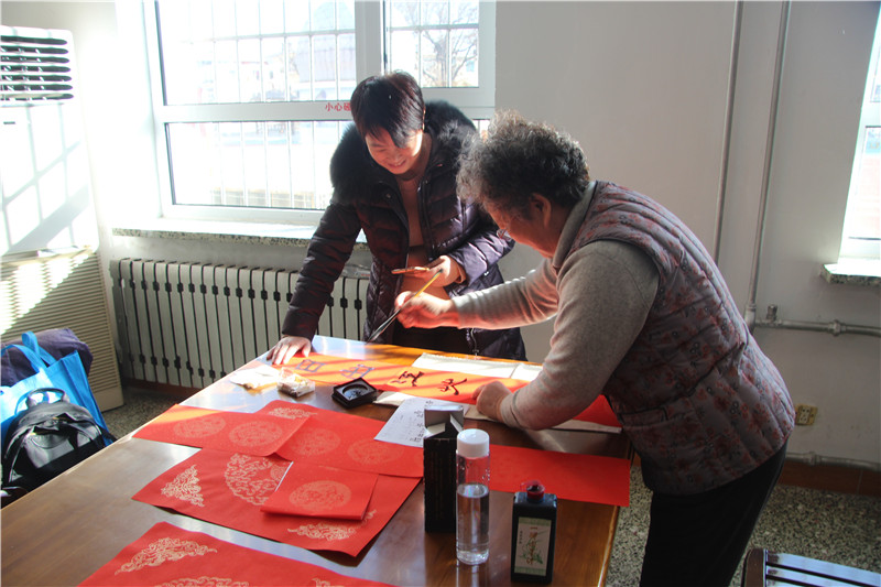 辖区书法家、书法爱好者们纷纷赶到笔会现场,大家兴致高昂,尽情的挥笔洒墨,在鲜红的纸上为社区居民创作出风格各异的春联和“福”字,一副副春联不但为居民提前带来了节日的气氛,而且让辖区居民体验到了中华传统民俗文化的魅力。短短一个小时,就在大家的期待中新鲜出炉了将近130幅春联、福字,全部春联作品在图书馆大厅为辖区居民展示。居民们一边欣赏书法创作,一边品评春联寓意,一幅幅喜庆的春联和福字让居民欣喜不已。