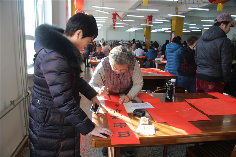 2018戊戌狗年春节将至,为弘扬民族传统文化,践行社会主义核心价值观,“坚定文化自信,推动文化繁荣”,营造热闹的新年气氛,2018年2月5日9时30分,大连市沙河口区图书馆在图书馆大厅举办“妙手挥春 泼墨迎新”书法笔会。马栏街道兰青社区的 孙枝梅、兰园社区的 王思勇、广场社区的 何涛,3位辖区书法家代表马栏街道应邀参加了书法笔会,与众多书法家、书法爱好者欢聚一堂,挥毫泼墨,写春联,送祝福,为辖区居民带来浓浓的年味。