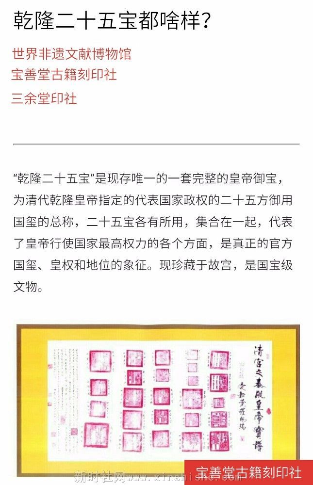 [新时社记者 趙志丹/文献报道]“乾隆二十五宝”是现存唯一的一套完整的皇帝御宝,为清代乾隆皇帝指定的代表国家政权的二十五方御用国玺的总称,二十五宝各有所用,集合在一起,代表了皇帝行使国家最高权力的各个方面,是真正的官方国玺、皇权和地位的象征。现珍藏于故宫,是国宝级文物。