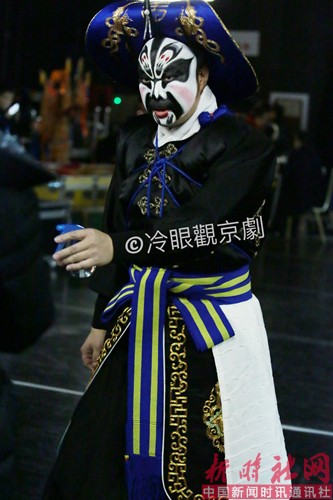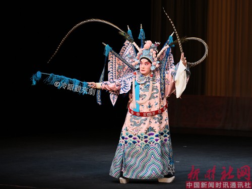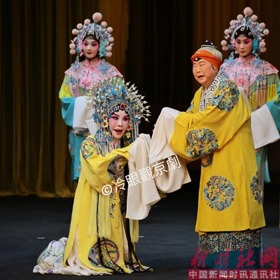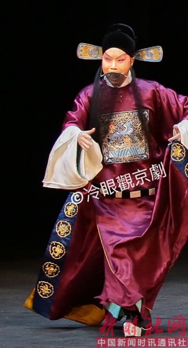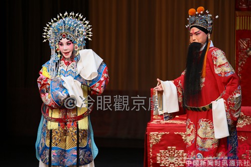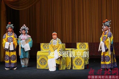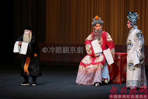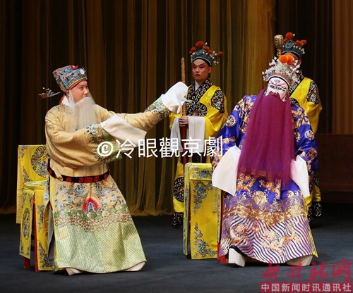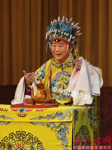 如下圖,念完定場詩後,李老太太無奈地垂下了水袖,隨後青年京劇團演出負責人洪軍科長在後台語音解釋是因為電腦故障請觀眾諒解,之後演出才得以繼續進行。(後來從“甘露寺”一場孫權唱道“人馬扎在甘露寺”時開始有字幕)。