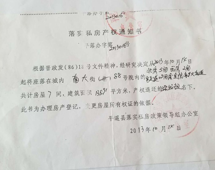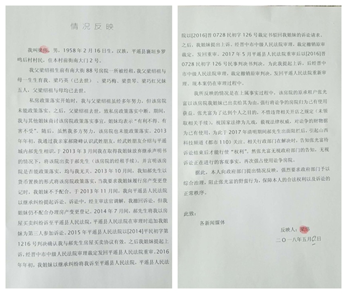 我所反映的情况是在上属事实过程中,该房院的原承租户张光富以该房院我姐妹已出卖给其为由,强行将讼争的房院归为己有使用获益。张光富为了达到个人之目的,不惜违背相关开店之规定(未领取相关手续),视国家法律为儿戏,藐视法律权威,对讼争的财物据为已有使用,为此于2017年清明期间郝先生出面阻拦后,引起山西科技频道《都市110》关注。相关行政部门在解决时,告知张光富待诉讼结束后才能行使“权利”。然张光富无视政府部门的告知,无视诉讼正在进行的客观事实,再次强占使用讼争房院。