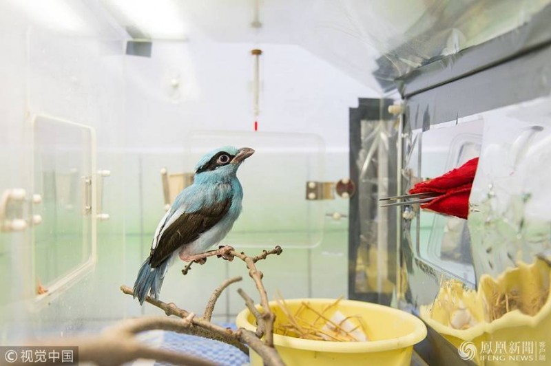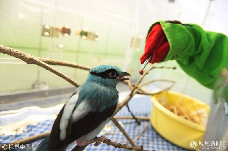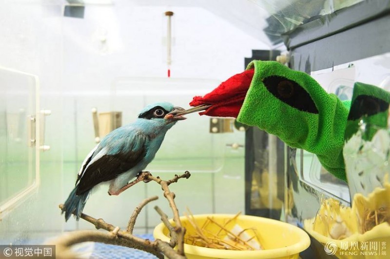 当地时间2018年4月23日,捷克布拉格,一名动物园饲养员利用手偶假扮成鸟妈妈向一只仅43天大的爪哇绿鹊喂食。图片作者:Anadolu Agency/视觉中国