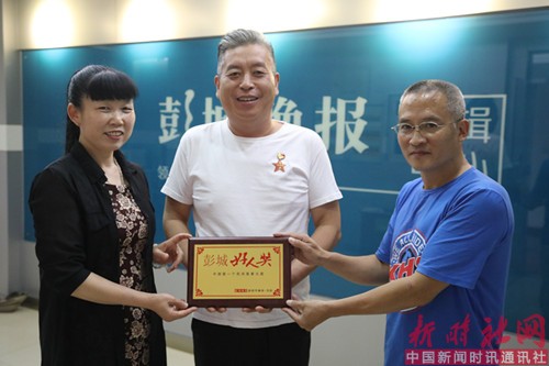 中国时讯网徐州讯(记者 陈宝红 通讯员 方美侠 张荣光 )7月9日,徐州报业集团旗下的彭城晚报社向捡到五万元救命钱归还失主的丰县华山镇好党员万利忠颁发“彭城好人奖”奖牌,以表彰他拾金不昧的大爱之举。