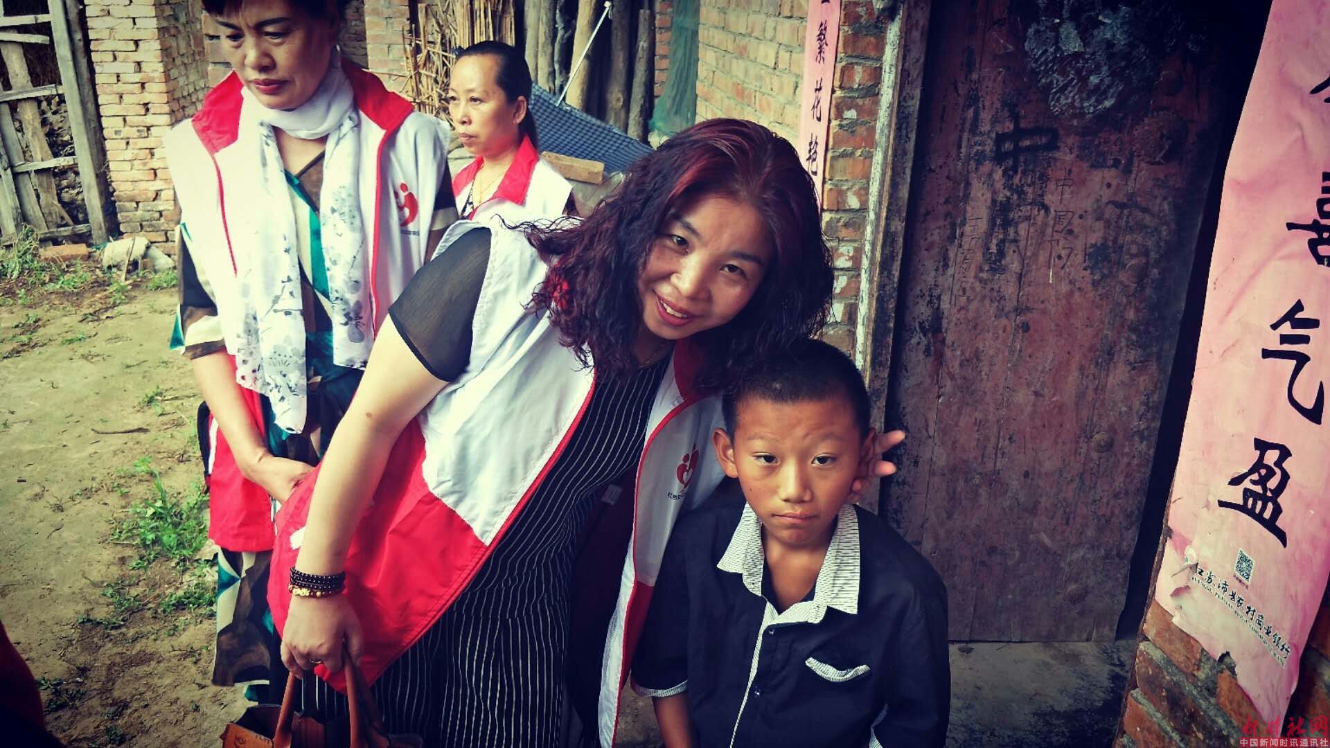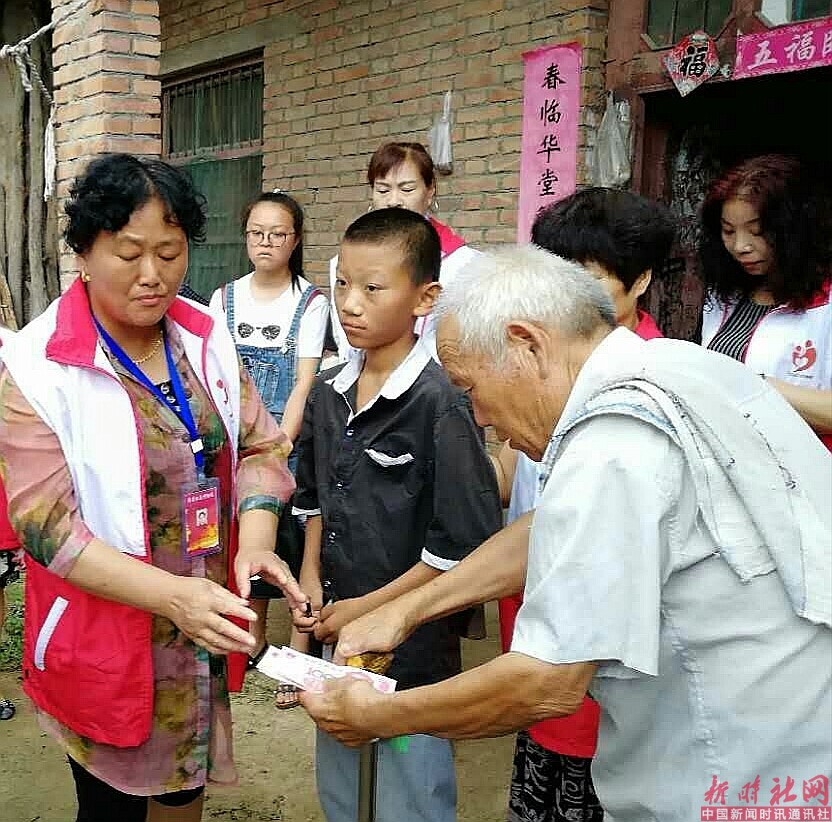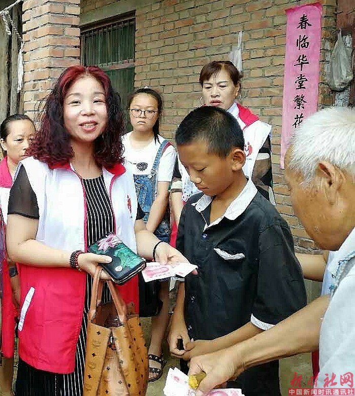 会长李夫芝将志愿者捐助的1000元现金交到小成玉的手里,爱心人士唐玉霞拿出200元交给小成玉,抚摸他的头,叮嘱他要听爷爷的话,做个乖孩子。