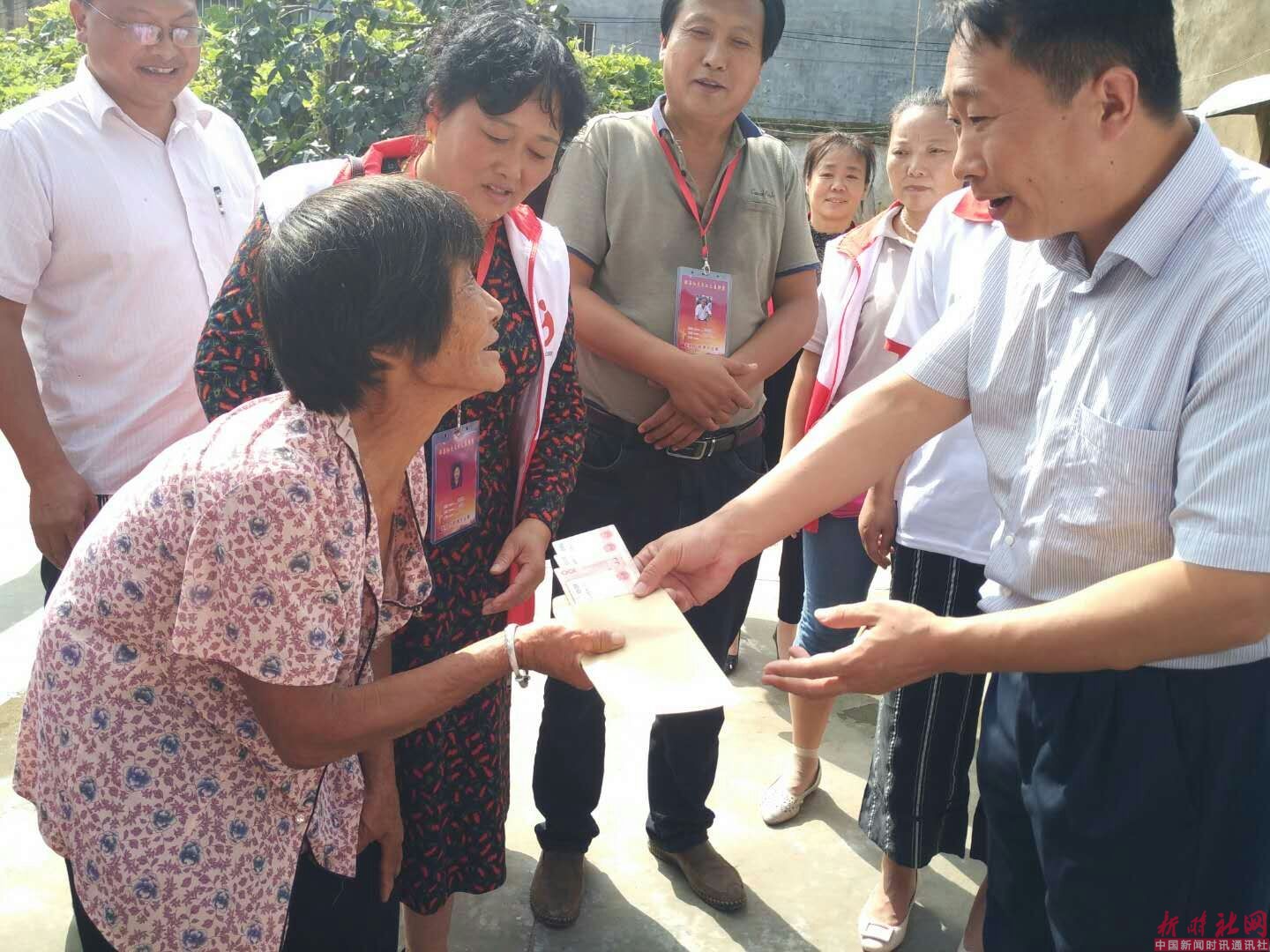 志愿者一行带着沉甸甸的爱心随后又来到蒋庄村,看望慰问了贫困户刘淑兰,并给老人500元过节费,志愿者们的再次到来,让老人喜出望外,拦着张会长的手连声表示感谢,久久不愿松开。
