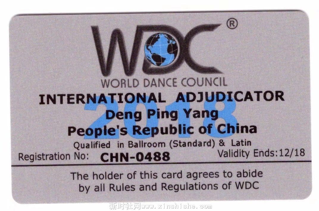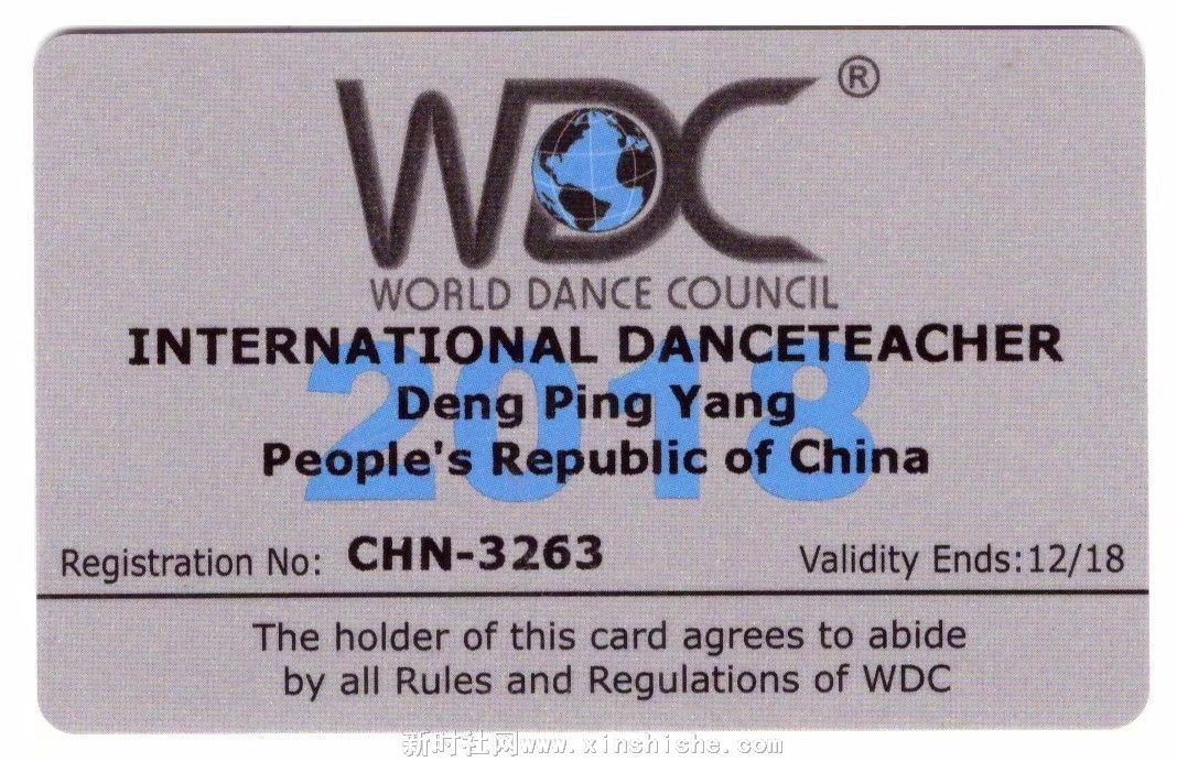 经考核,石家庄锐舞艺术中心杨等平老师,取得2018年度WDC国际级评审任职资格,成为石家庄地区第一位通过2018年检WDC国际评审、WDC国际教师。WDC是世界舞蹈理事会的英文简称,是世界职业(国标)舞蹈的权力机构。2014年中国以“中国舞蹈理事会NDC”的名义加入WDC,NDC成为代表中国参加WDC组织的唯一正式会员。
