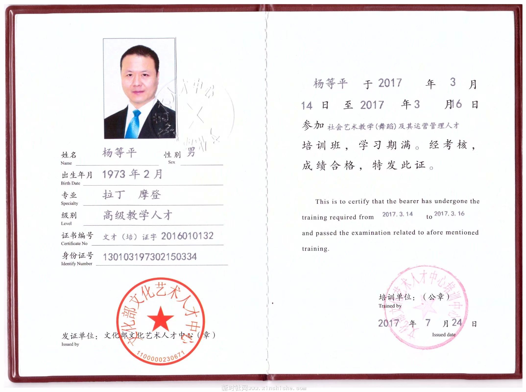 经过培训考核,石家庄锐舞艺术中心杨等平老师,取得文化部文化艺术人才中心国标舞高级教学人才证书,也是石家庄地区首位取得,文化部人才中心国标舞高级教学人才证书的教师。