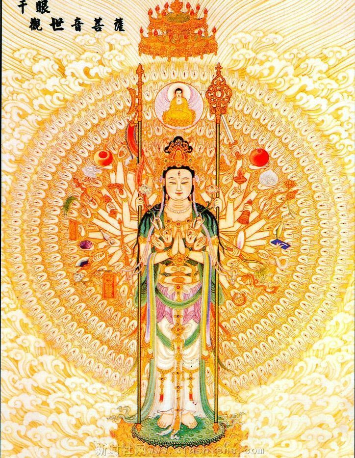 有一次佛陀告诉阿难尊者说:“如是神咒,有种种名:一名广大圆满,一名无碍大悲,一名救苦陀罗尼,一名延寿陀罗尼,一名灭恶趣陀罗尼,一名破恶业障陀罗尼,一名满愿陀罗尼,一名随心自在陀罗尼,一名速超上地陀罗尼。”它的被称为千手千眼观世音菩萨的因由是:一次他在千光王静住如来住所时,静住如来特为了他说了“广大圆满无碍大悲心陀罗尼”,并且对他说:“善男子!汝当持此心咒,普为未来恶世一切众生作大利乐。”当时观世音菩萨听了此咒后,即由初地证至第八地——不动地。于是发出誓愿说:“设我当来之世能利乐一切众生者,令我即时身生千手千眼具足。”如此发愿后,果真顿时身生千手于眼,并且十方大地为之震动,十方诸佛亦都放出无量光明,遍照十方的无边世界。