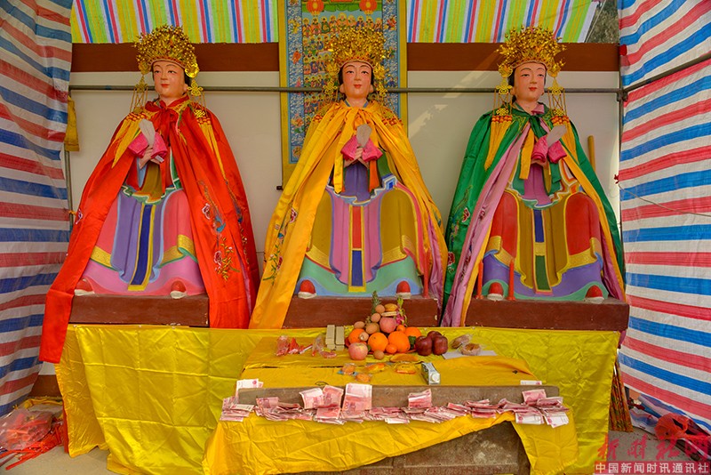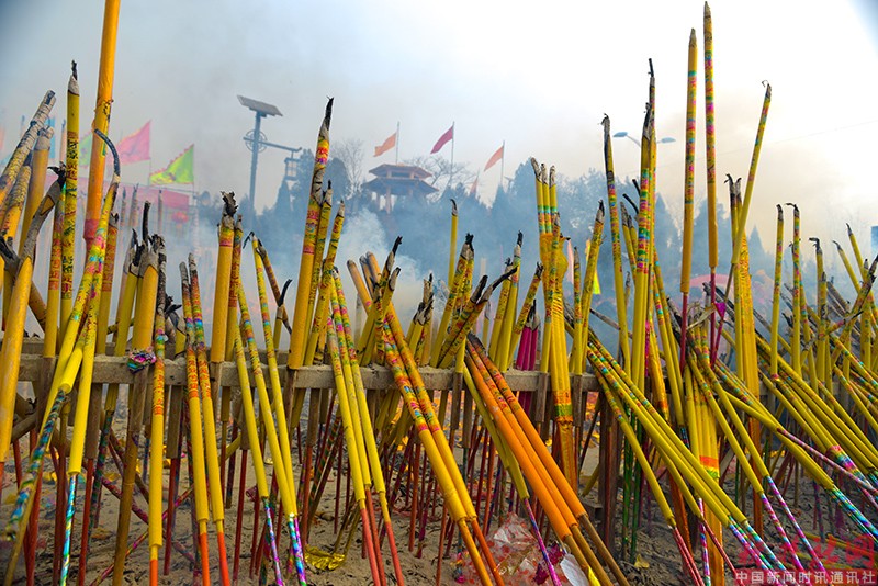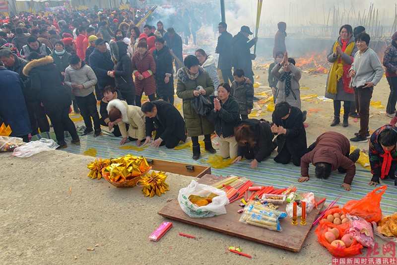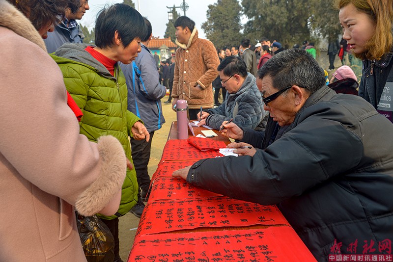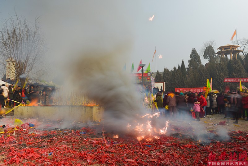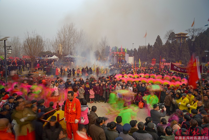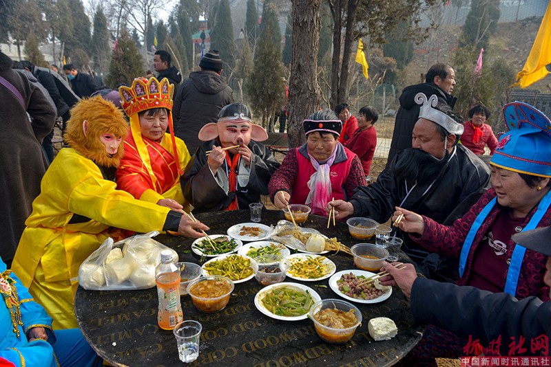上午8时30分许,记者在省道S212线去往堌堆村的道路上看到,前来拜祭祖先的人群如潮水般涌向瑕丘遗址,村西侧临时开辟出来的一个大型停车场已被各种车辆占去了大半。越往里走交通愈加拥堵,卖小吃、气球、挂件的商贩早早支起了摊位,招揽着过往的群众。遗址前,锣鼓声、鞭炮声震耳欲聋,舞狮、秧歌、旱船等丰富多彩的民间艺术表演不时赢来阵阵掌声。摄影爱好者们也端着“长枪短炮”,用镜头记录下一幕幕独特的民俗场景。遗址西侧一个院落内,临时搭建的上百张餐桌已经坐了不少人。“不到9点就有人来吃了。”庙会执勤人员堌堆村村民邱双进说,每个来赶庙会的人只要交10元钱就可以与其他人同吃一锅饭,还有很多群众提前进行了预定。