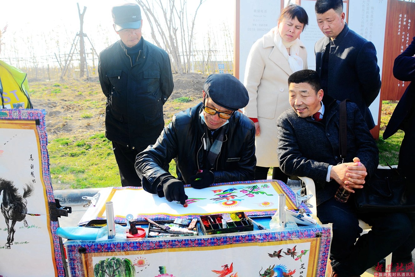 彩字画民间手艺传承人,江苏连云港灌云县同兴镇的黄以功老先生,今年已七十高龄,从事彩字画手艺三十余年。这是他应购买字画的游客要求书写彩字。2019.3.15摄于连云港灌云县同兴镇伊芦梅园景区。