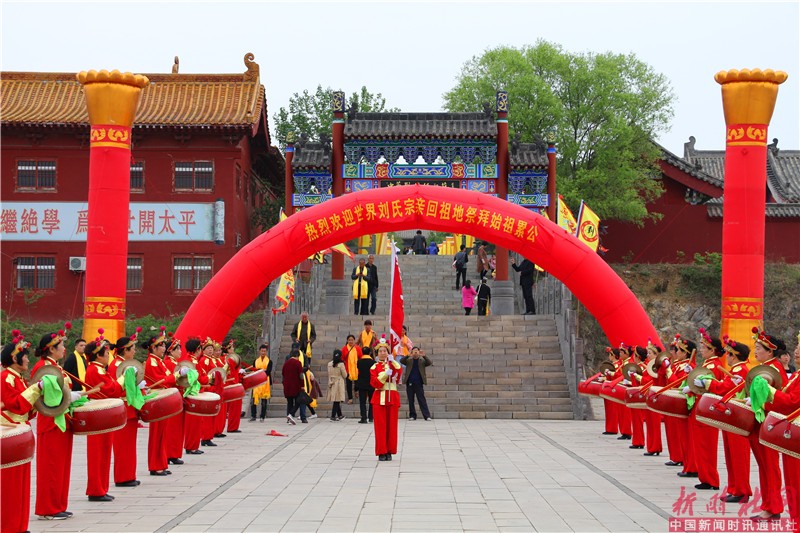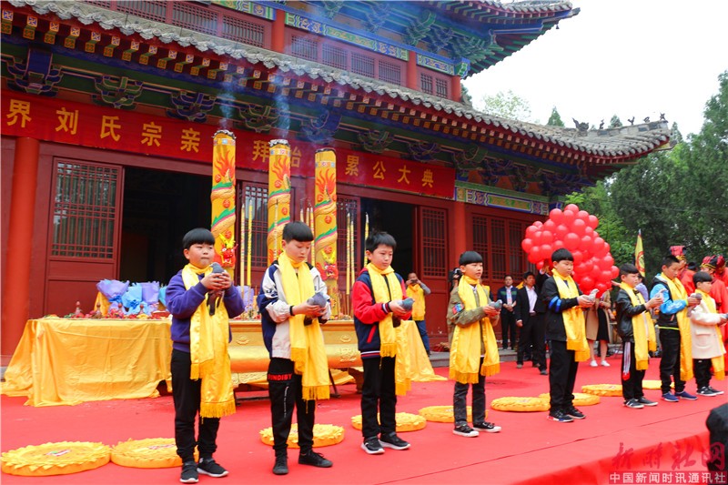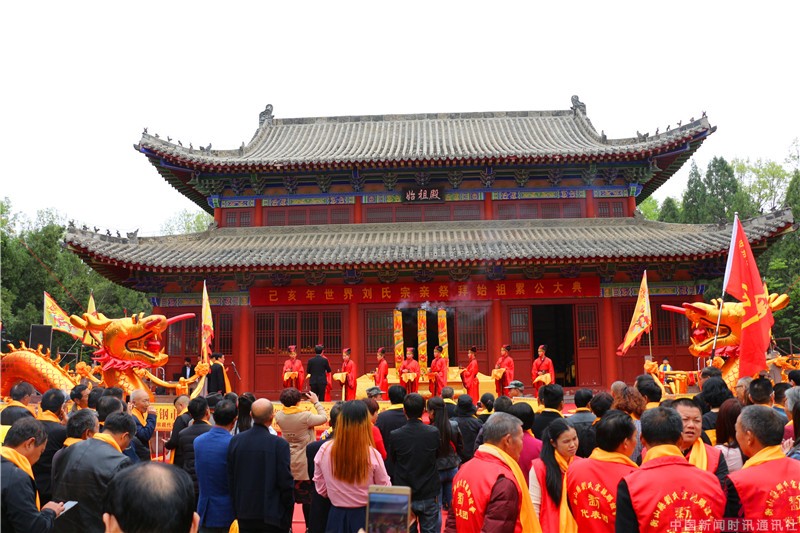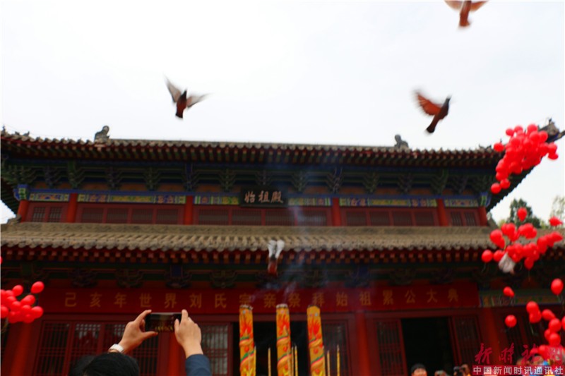 刘氏始祖累公,尧之后裔,惠及黎百,泽润苍生,实德明昌,青史垂明。祖地以每年4月19日为祭拜累公之日,千百年来沿袭至今。今天在美丽的昭平湖畔,世界刘氏祖地--始祖累公大殿前汇聚了来自世界各地的千余位刘姓宗亲,隆重举行己亥年世界刘氏宗亲寻根拜祖大典。大典议程由刘天旭宗长主持,遵照鸣盛世礼炮、敬献鲜花、初献爵、亚献肴、终献果、净手上香、恭读祭文、全体跪拜礼、颂歌祈福九项古礼祭拜仪式依序进行,在颂歌祈福议程中有8名刘姓少年手捧代表和平,幸福,美满象征的和平鸽步入祭坛,伴随着主持人祝福之声红色气球、和平鸽一起飞向蓝天。代表着全世界八千万刘氏子孙的美好愿望,祈福刘氏宗族的子孙后代福慧双修,繁荣兴旺,安居乐业,前程似锦,共同祈福我们的祖国繁荣昌盛、祖国富强、世界和平。