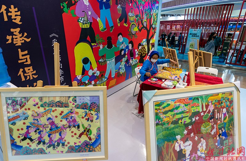 3月24日,农民画家刘琼丽带着自己的作品在首届云南昆明(国际)版权博览会上。