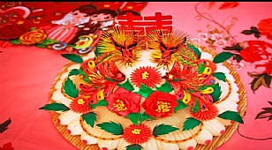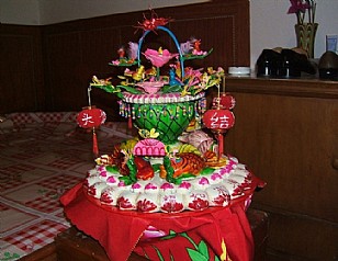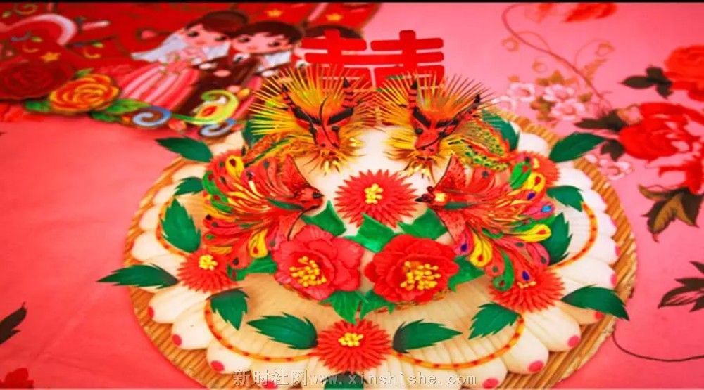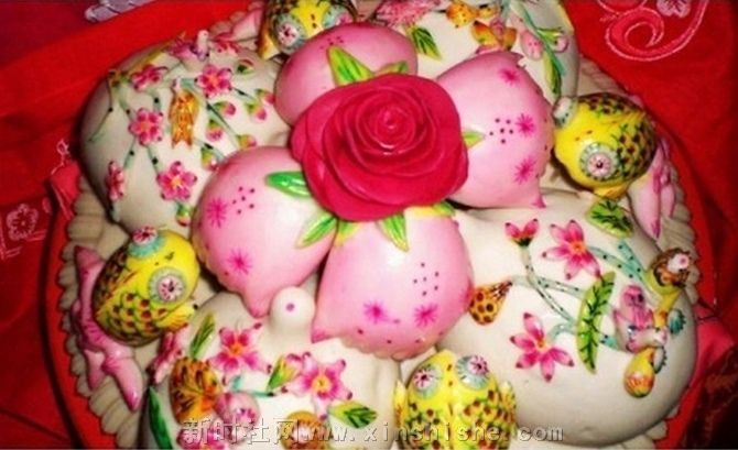 忻州一带,在婚娶之日,男女两家都蒸很多大“喜馍”。这些大“喜馍”,要摆在桌子上供人们欣赏、品尝。与此同时,还要蒸大“花糕”,有的地方习惯用十来斤面粉捏一个“花糕”。这种花糕,以面作圆底盘,卷条边缘为纹,铺一层红枣,上面再加上一层比第一层略小的带花边的面盘,上面捏上“鱼钻莲”的浮塑,蒸熟后加色点染,供人们欣赏和食用,也可作为礼品馈赠。