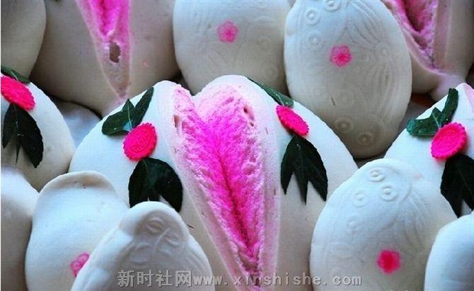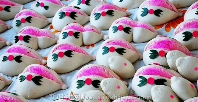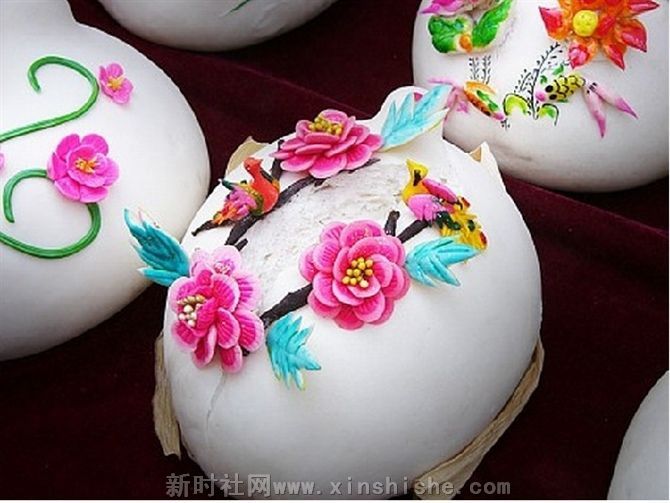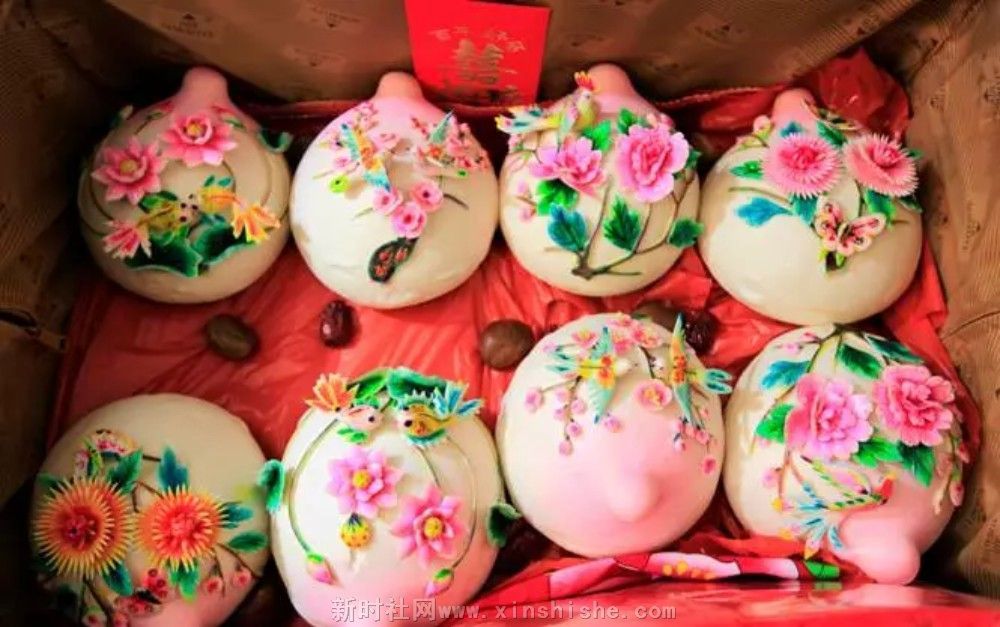 忻州一带的寿诞之期,也常蒸制“喜馍”。“喜馍”多以桃形为主体,上面加上各种寓意吉祥长寿的小装饰物,点染色彩,做为“寿馍”赠送亲友之用。